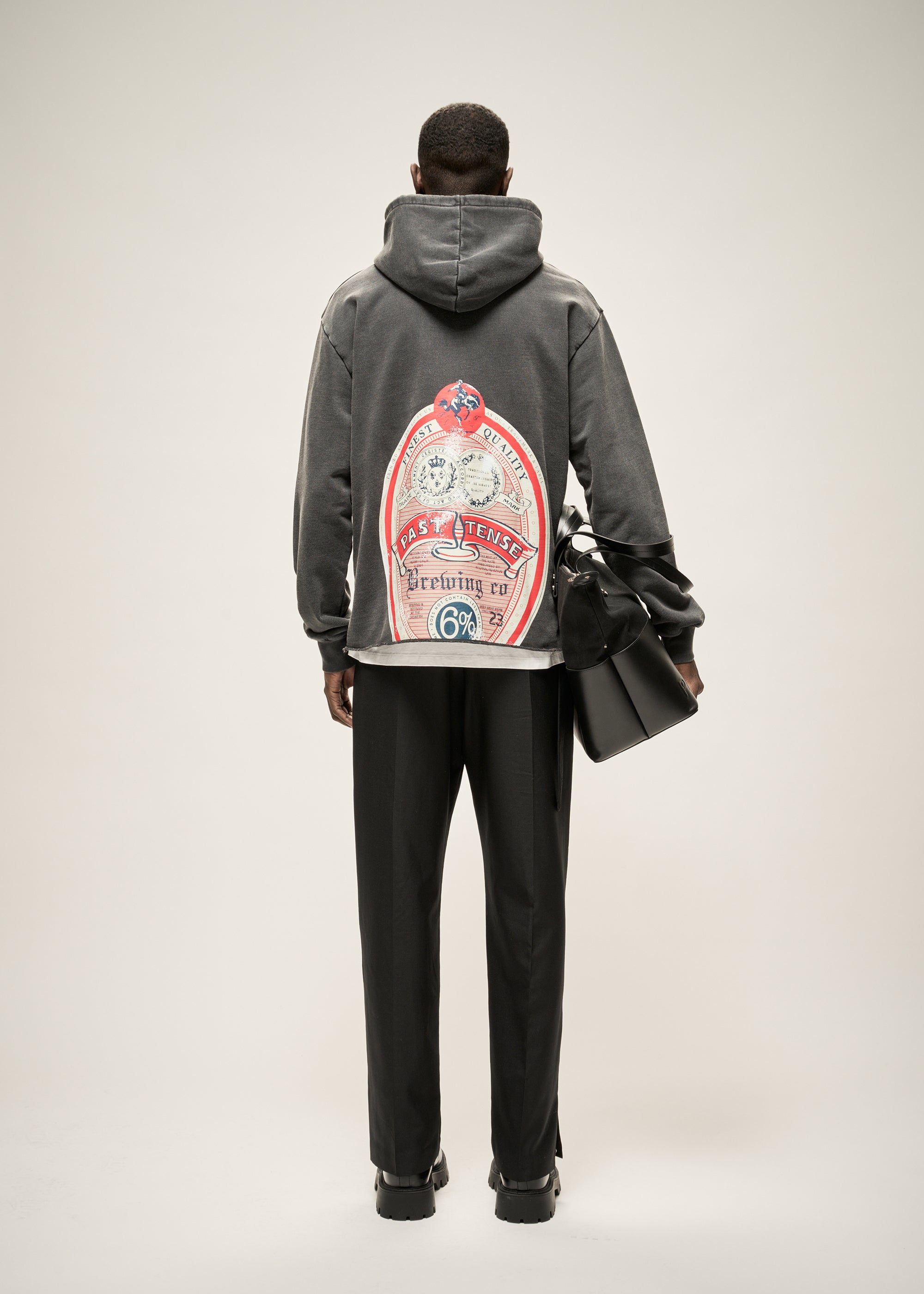 The Brewing Hoodie is crafted from heavy looped-back cotton, ensuring a sharp look and the outside and comfort and warmth of wear on the inside. The relaxed fit is complemented with a boxy shape. The garment is finished with the revisited logo printed at the chest and the brand's logo embedded into a beer label printed over the entire back. The hem is finished with a raw edge.