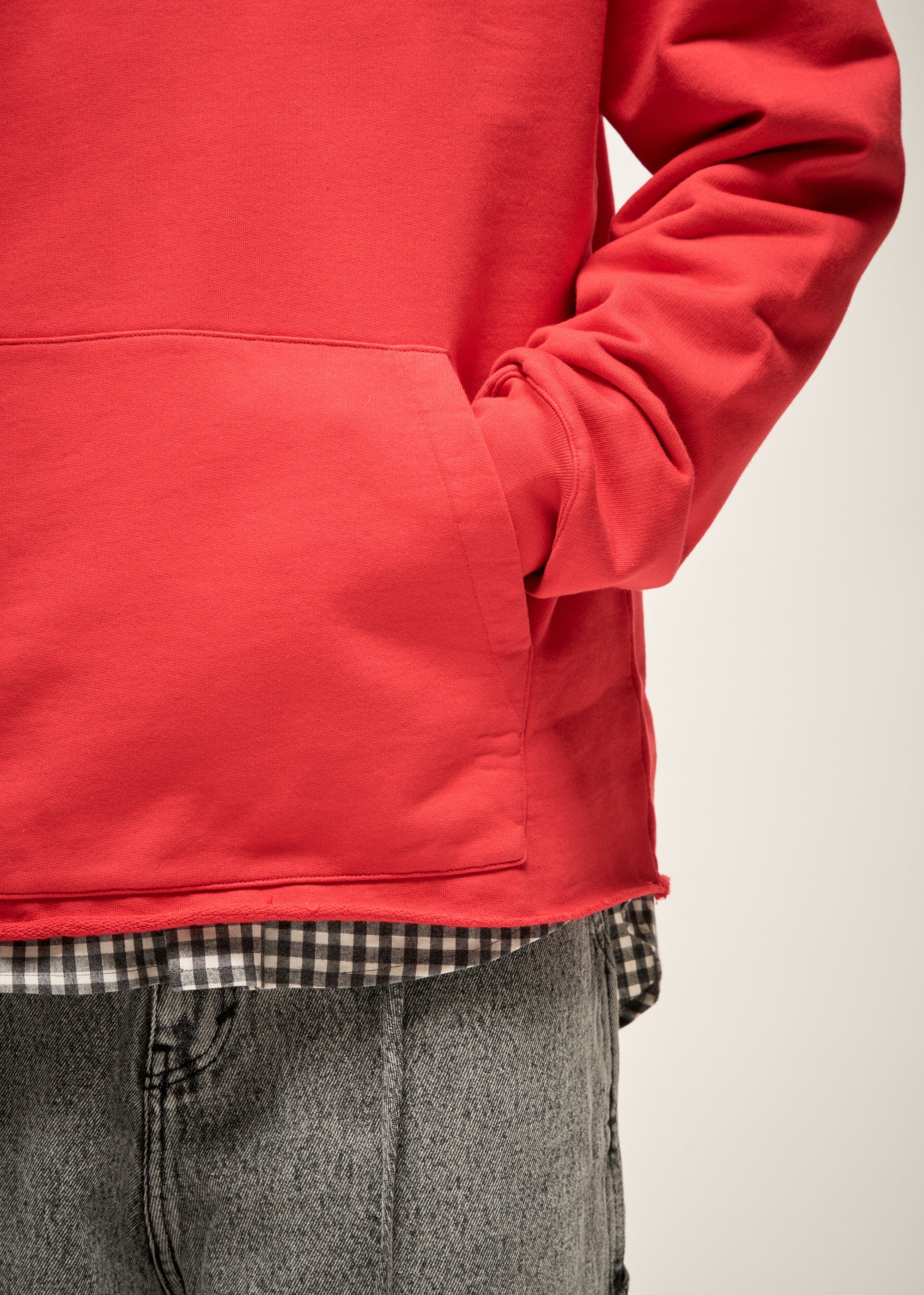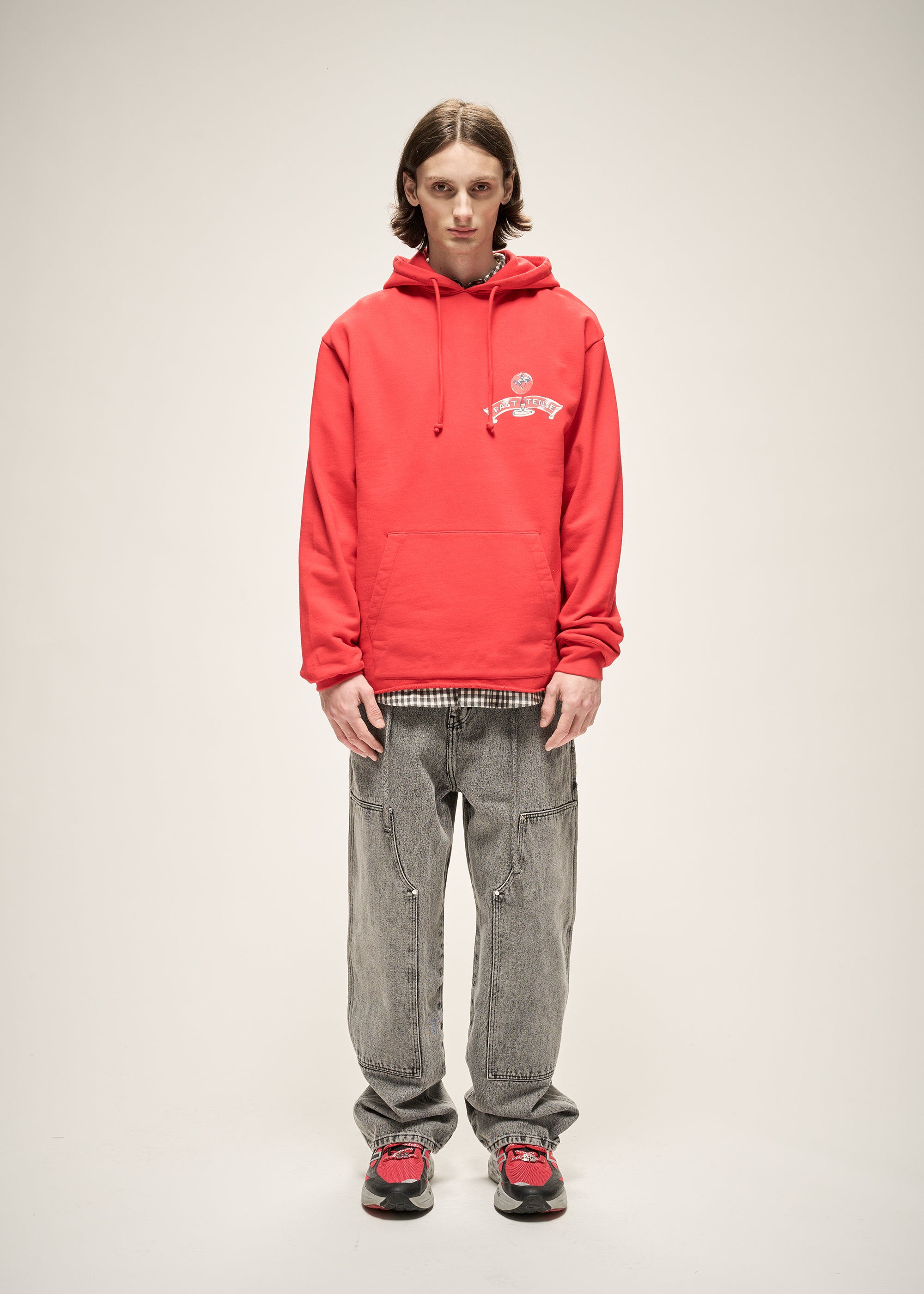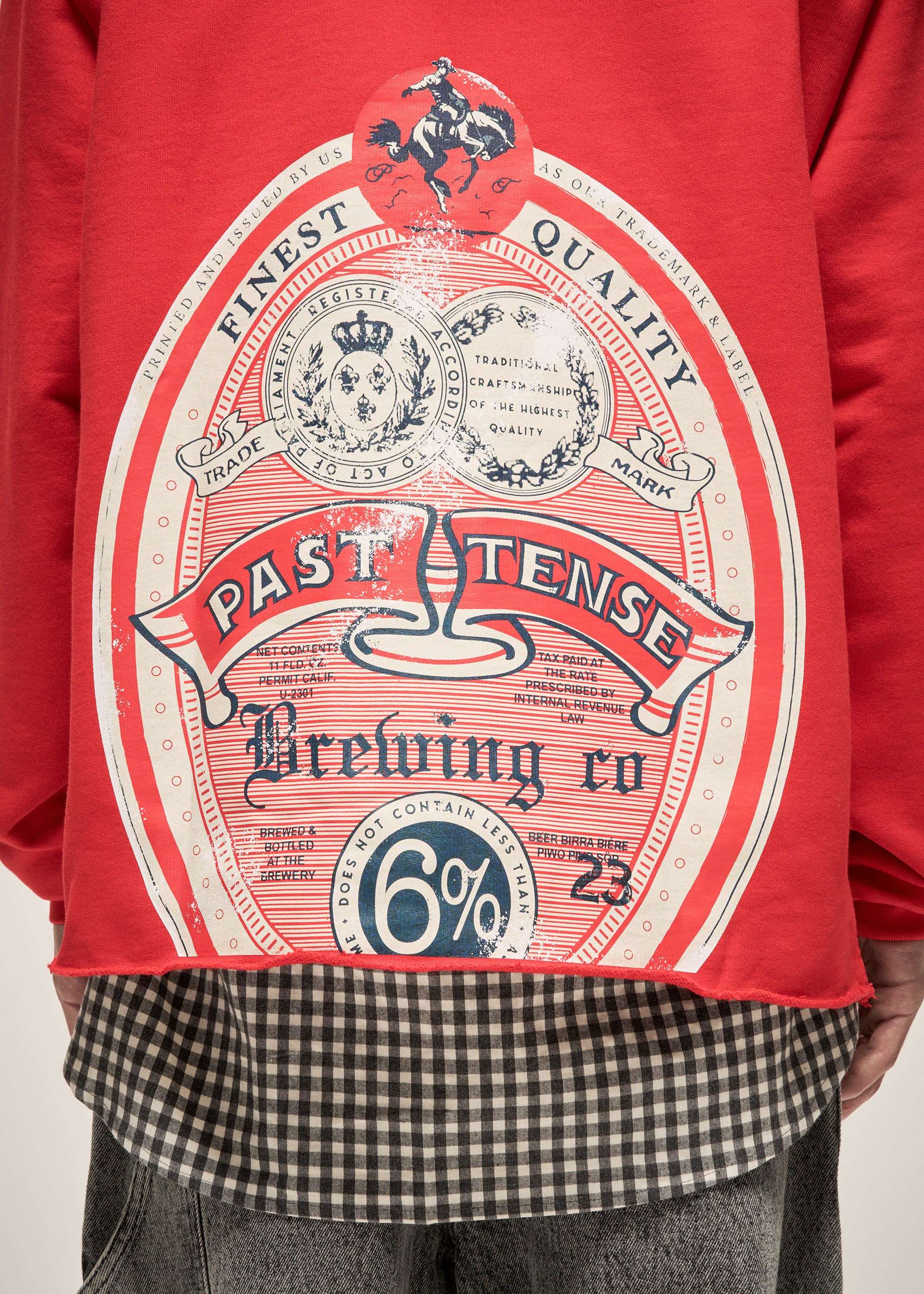 The Brewing Hoodie is crafted from heavy looped-back cotton, ensuring a sharp look and the outside and comfort and warmth of wear on the inside. The relaxed fit is complemented with a boxy shape. The garment is finished with the revisited logo printed at the chest and the brand's logo embedded into a beer label printed over the entire back. The hem is finished with a raw edge.