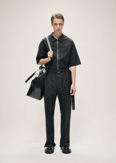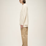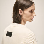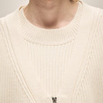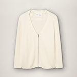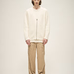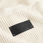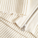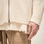 The Distressed Knit Zip Cardigan is made of a compact cotton/wool yarn, finished with handmade raw details at the hem, cuffs, and displaying the branded leather patch in the upper centre back.