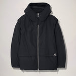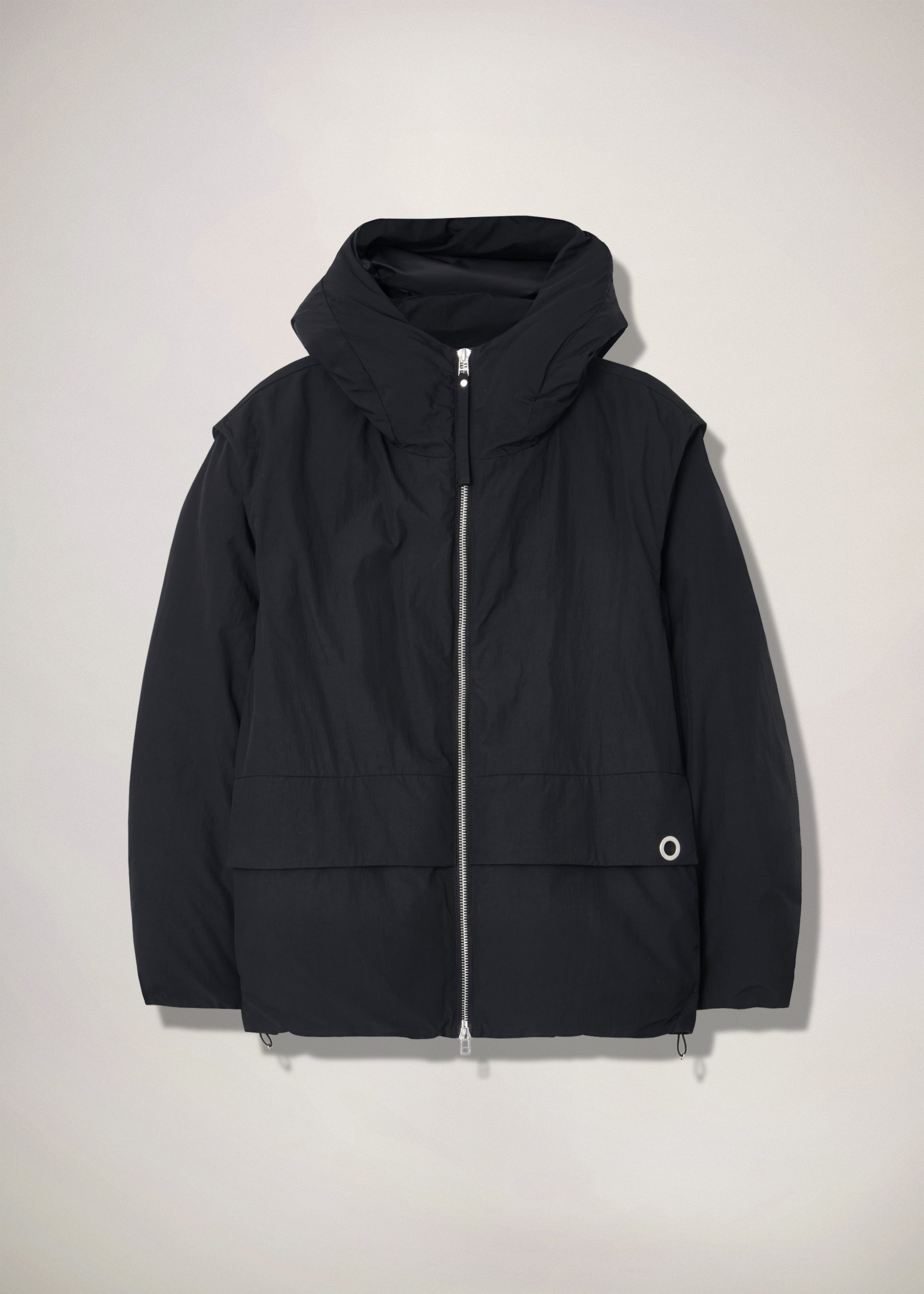The detachable sleeves make it possible to wear as a vest across seasons and the removable shoulder straps ensure that it can be carried as a backpack in between wears. Four outside pockets and one inside pocket complement the functionalities of the jacket. The branded ring on the left side flap adds an anchor point for key rings and carabiners.