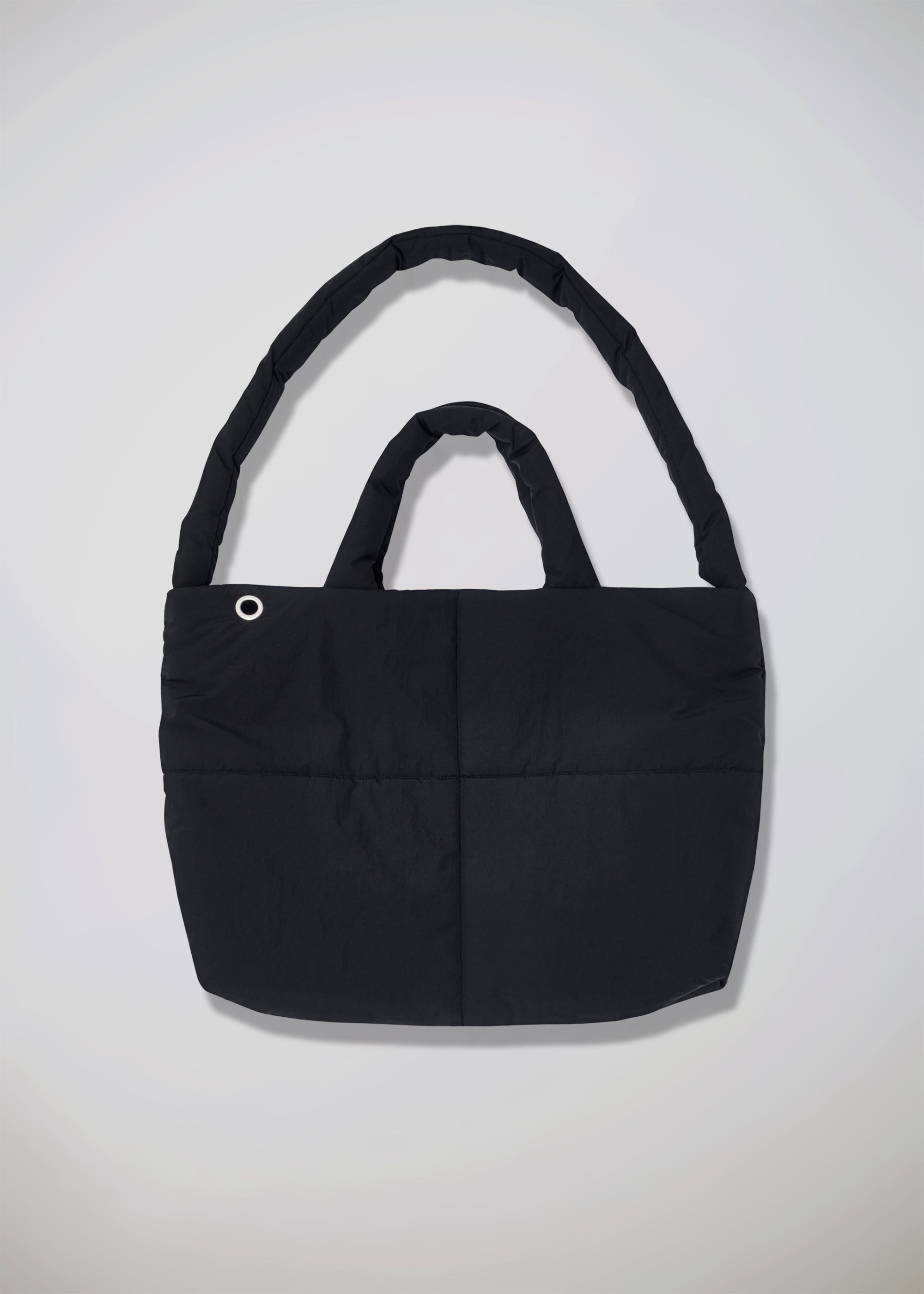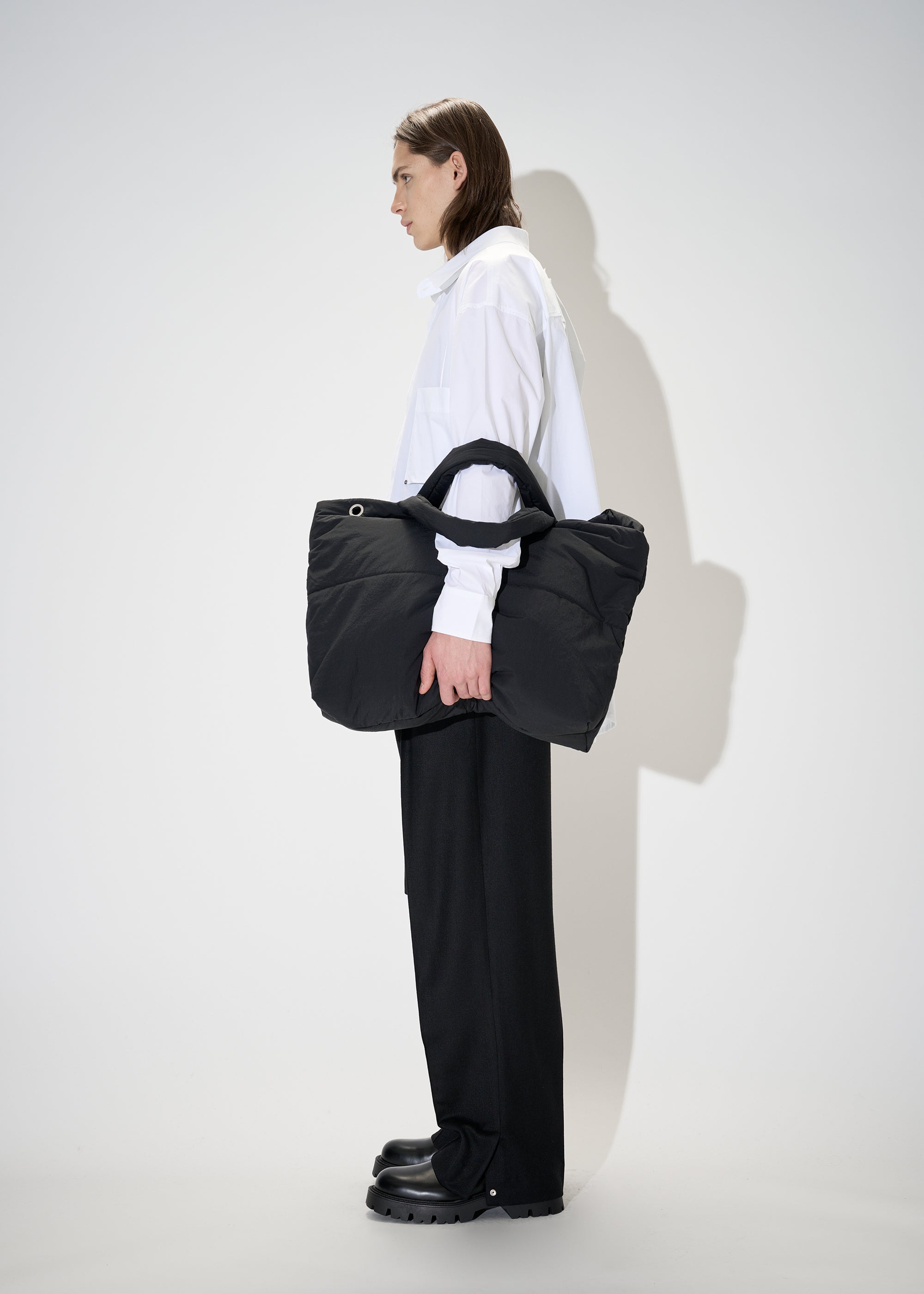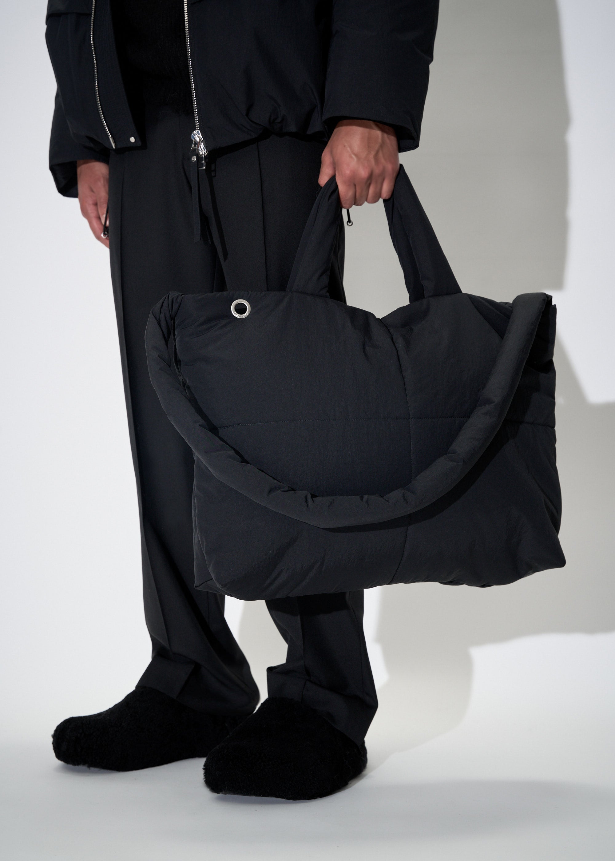 The Nylon Insulated Tote Bag is heavily padded for a puffy look and extra protection for your belongings. The nylon-cotton main fabric is finished with PFC-free water-repellent treatment to allow for harsh weather wear.