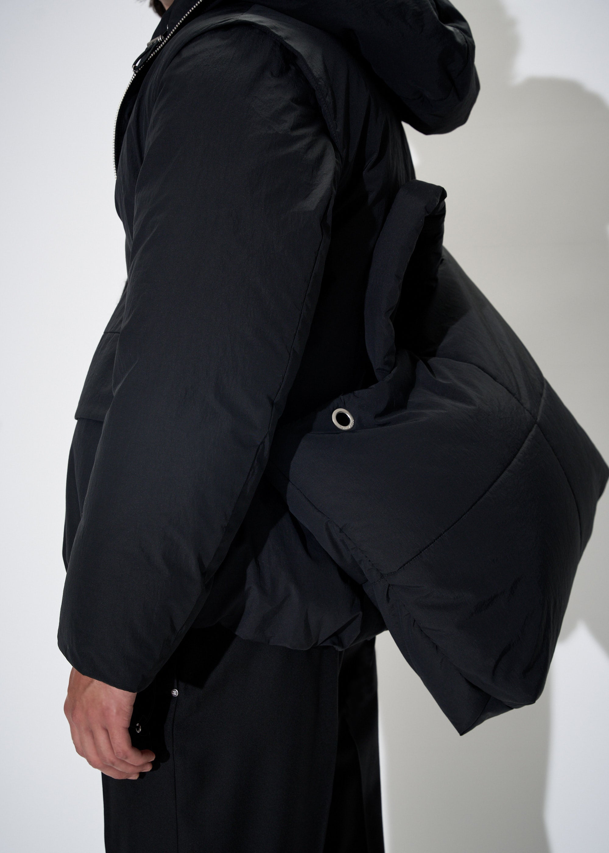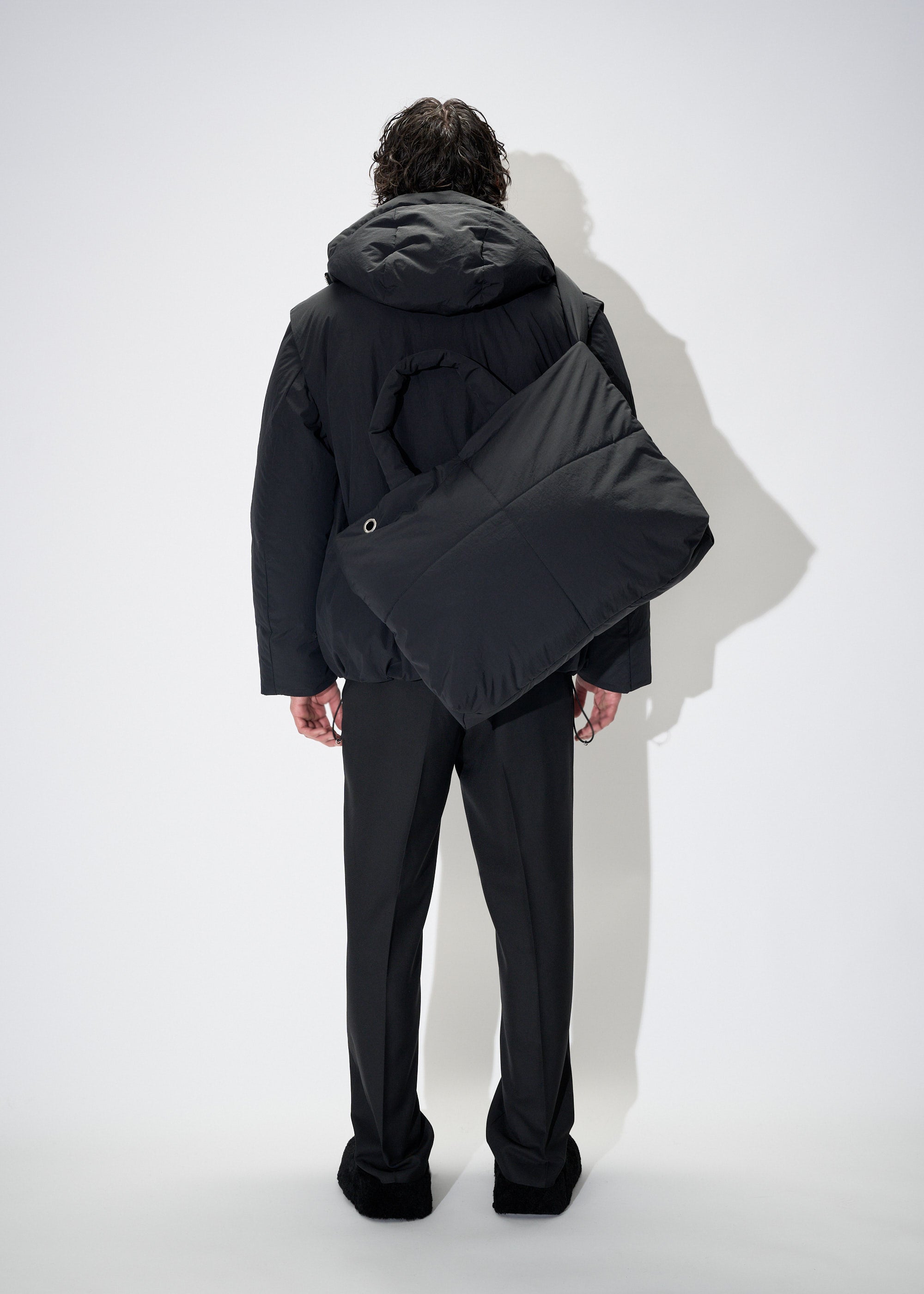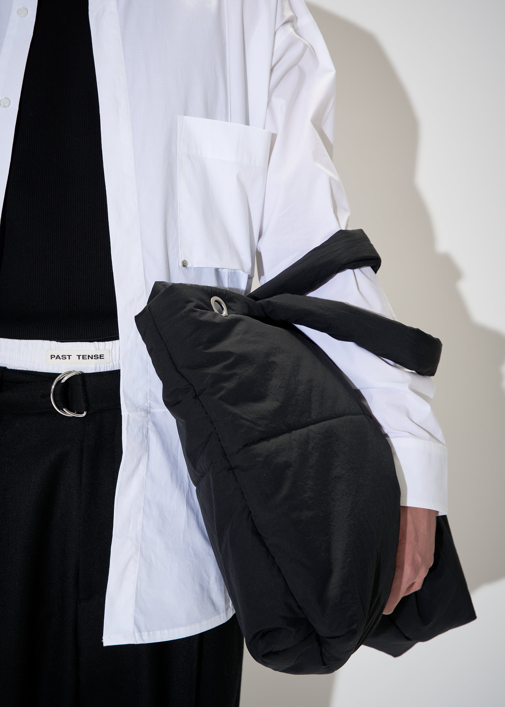 The Nylon Insulated Tote Bag is heavily padded for a puffy look and extra protection for your belongings. The nylon-cotton main fabric is finished with PFC-free water-repellent treatment to allow for harsh weather wear.