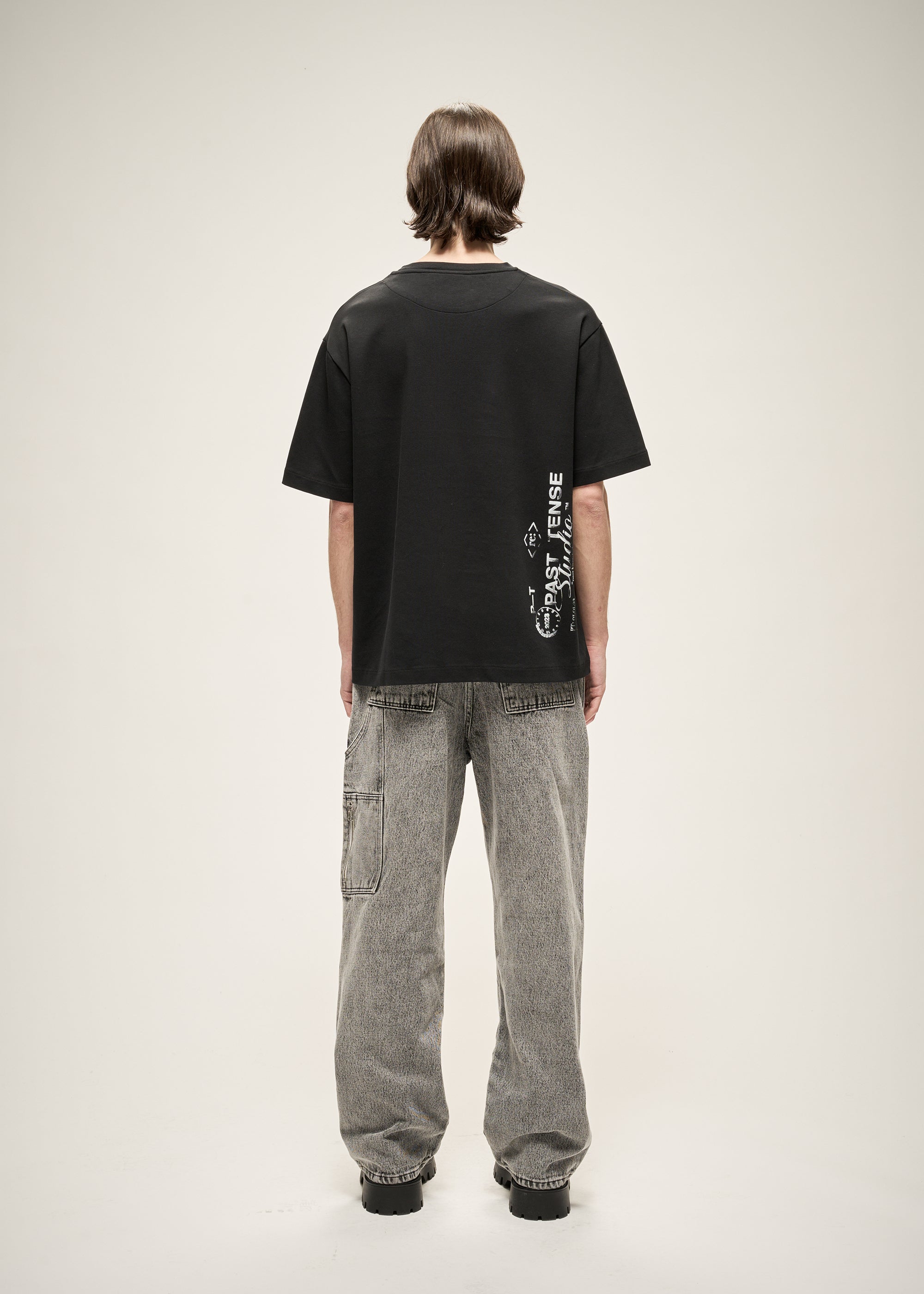 Screen-printed stamp logo at the lower back