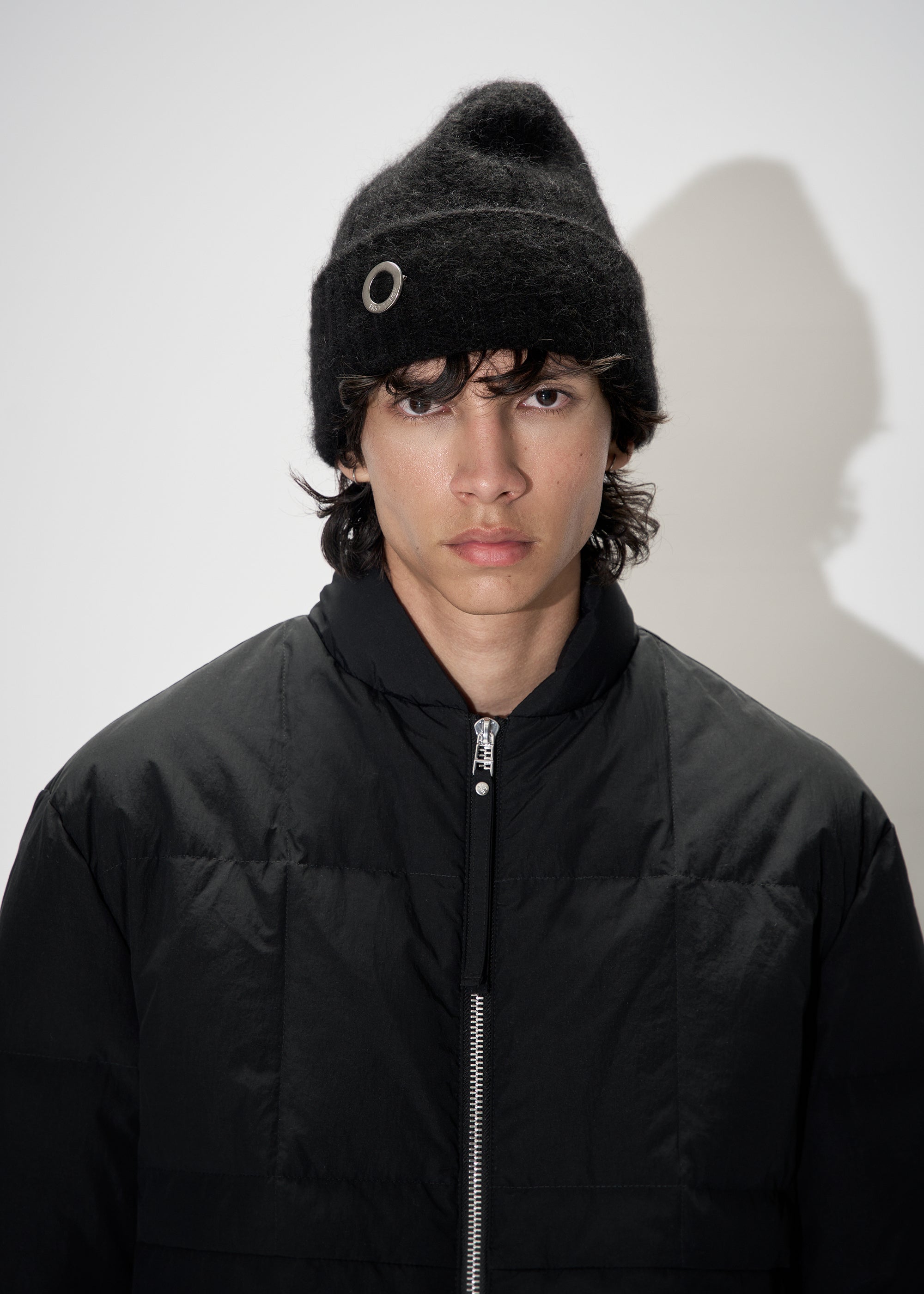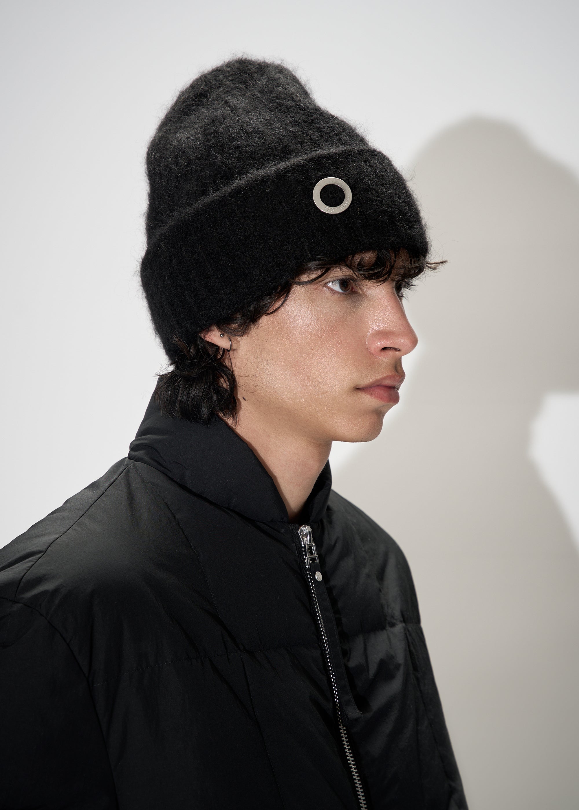 The Brushed Knitted Alpaca Beanie is made of one knitted panel in an oversized shape with a double-layered fold-up. The soft texture of the Alpaca yarn is enhanced with soft brushing to maximise comfort and warmth during the wear. It comes with a detachable branded metal brooch.