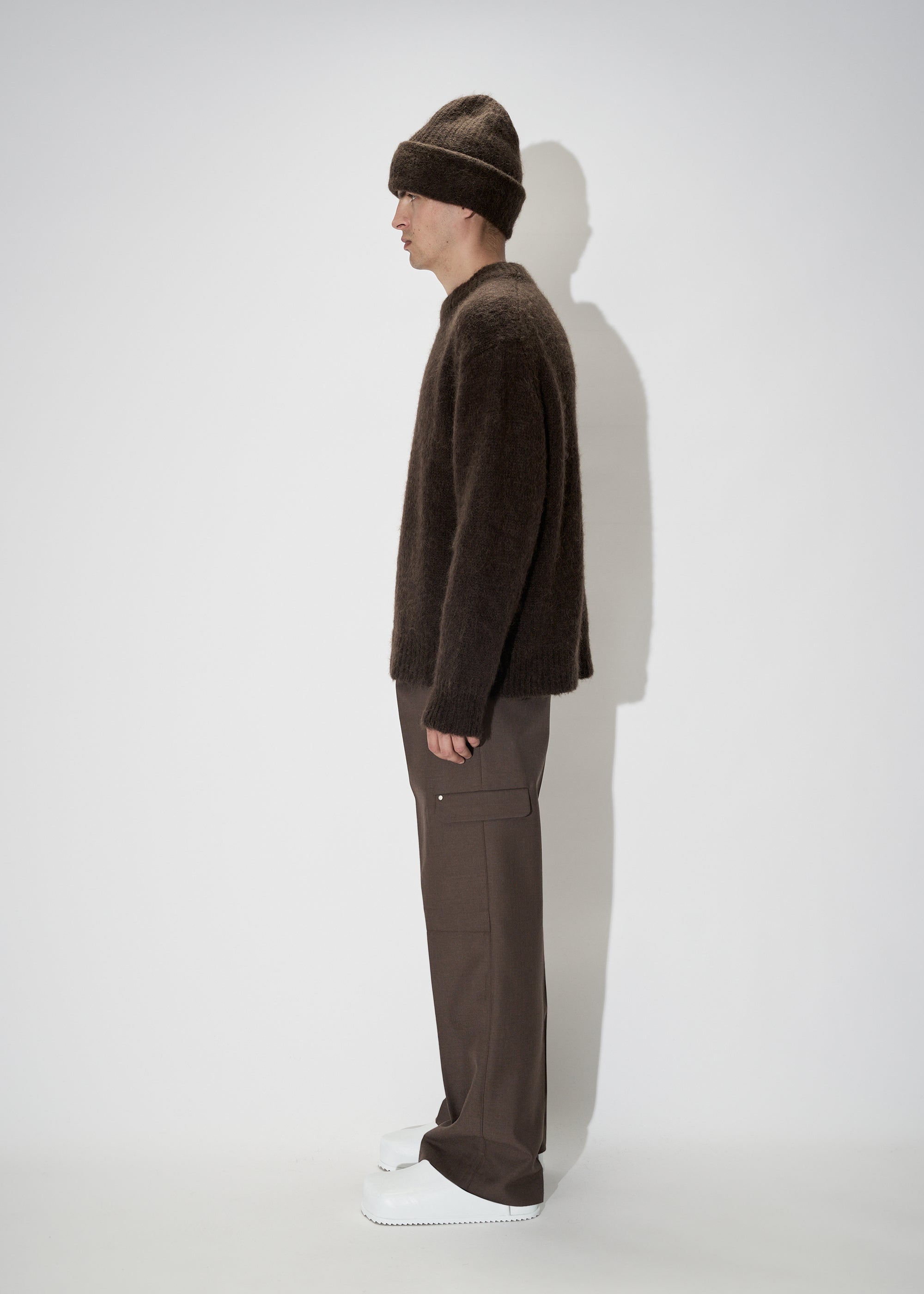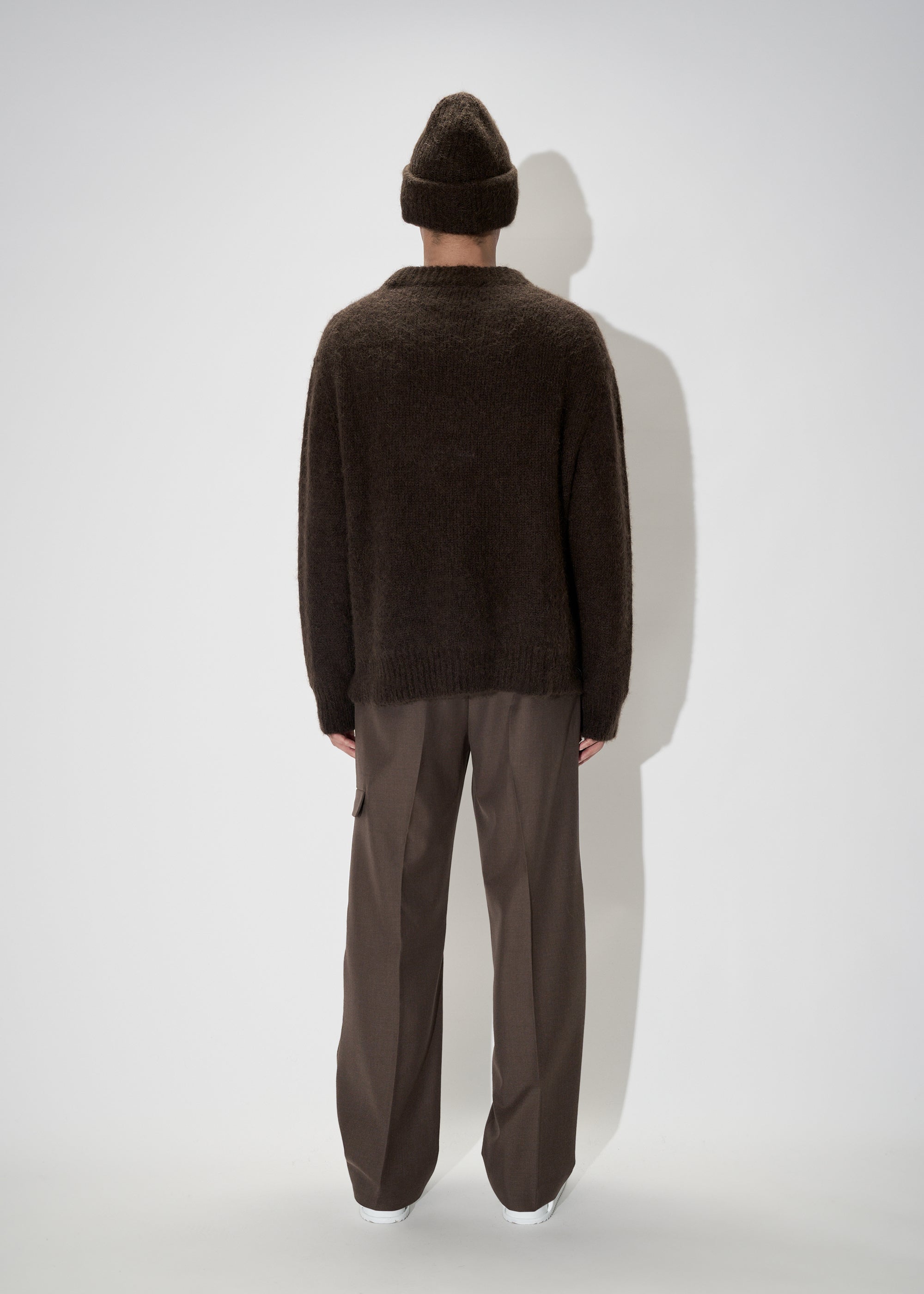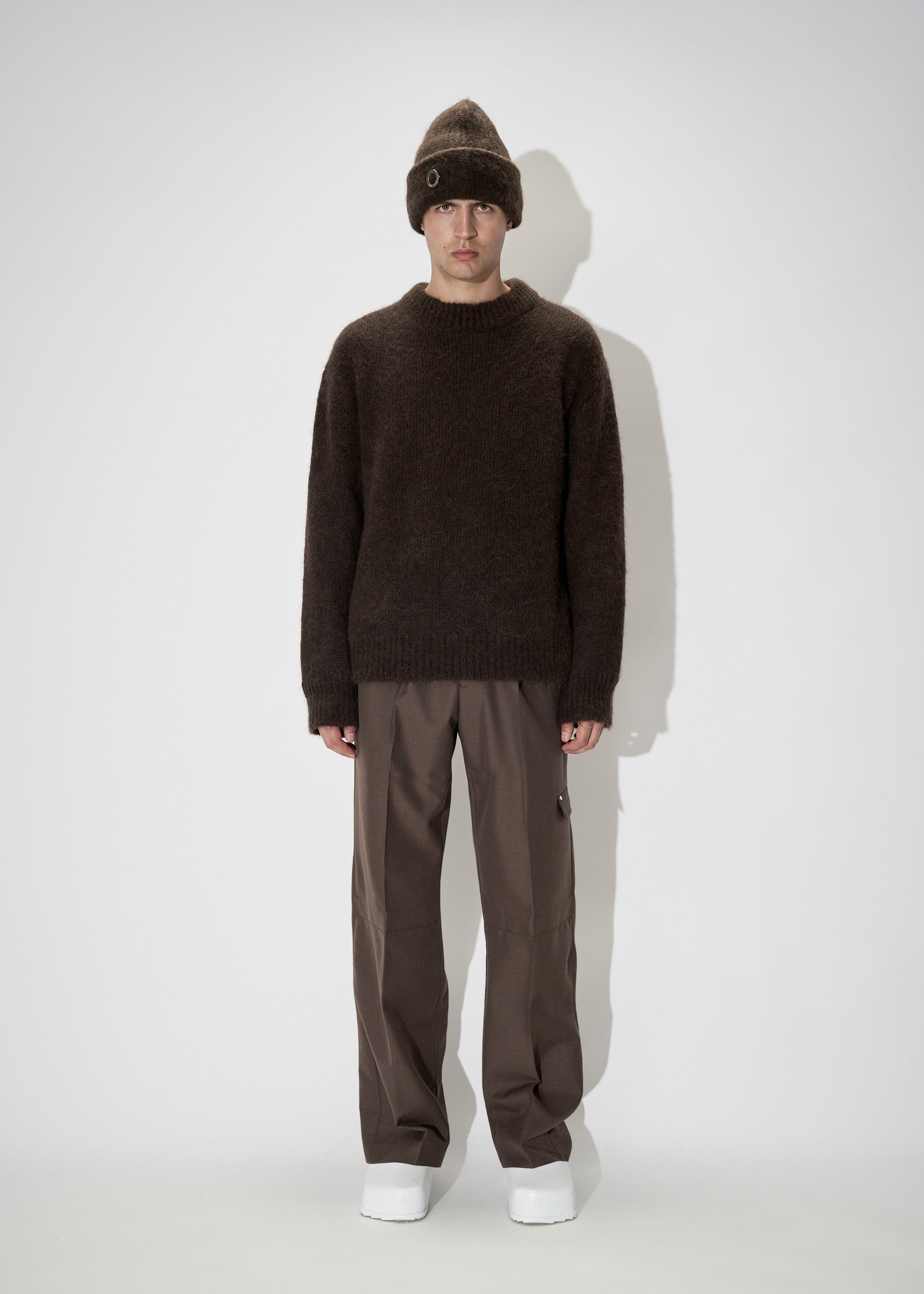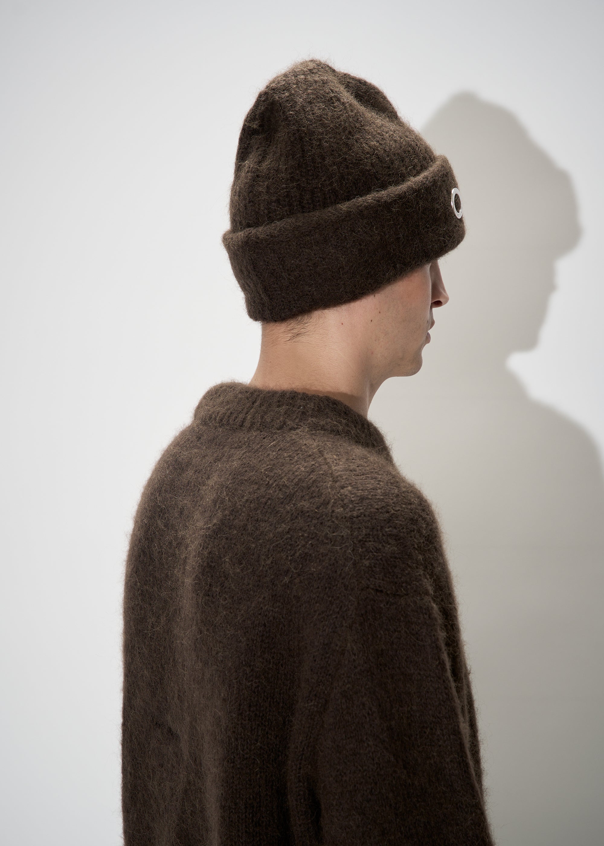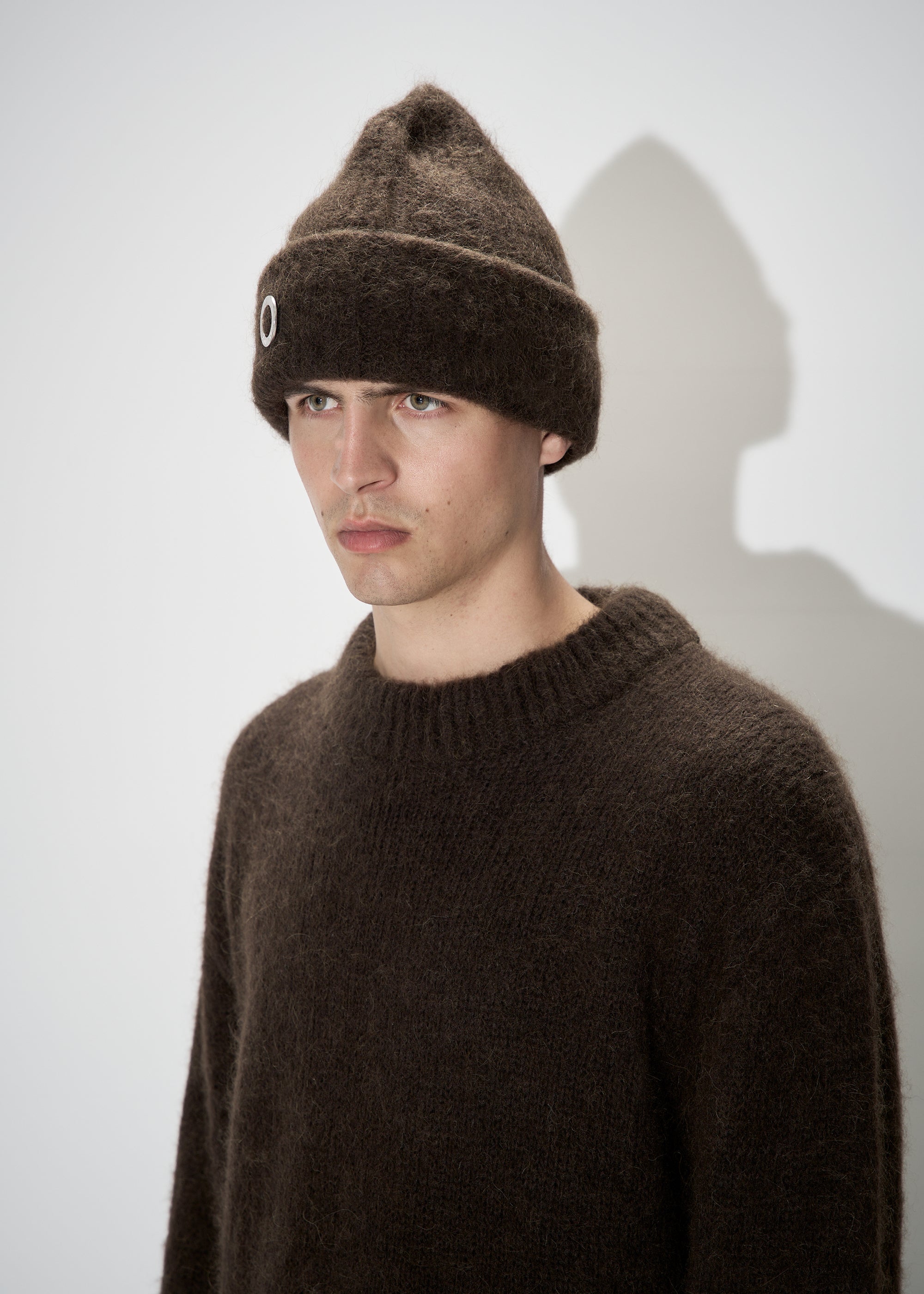 The Brushed Knitted Alpaca Beanie is made of one knitted panel in an oversized shape with a double-layered fold-up. The soft texture of the Alpaca yarn is enhanced with soft brushing to maximise comfort and warmth during the wear. It comes with a detachable branded metal brooch.