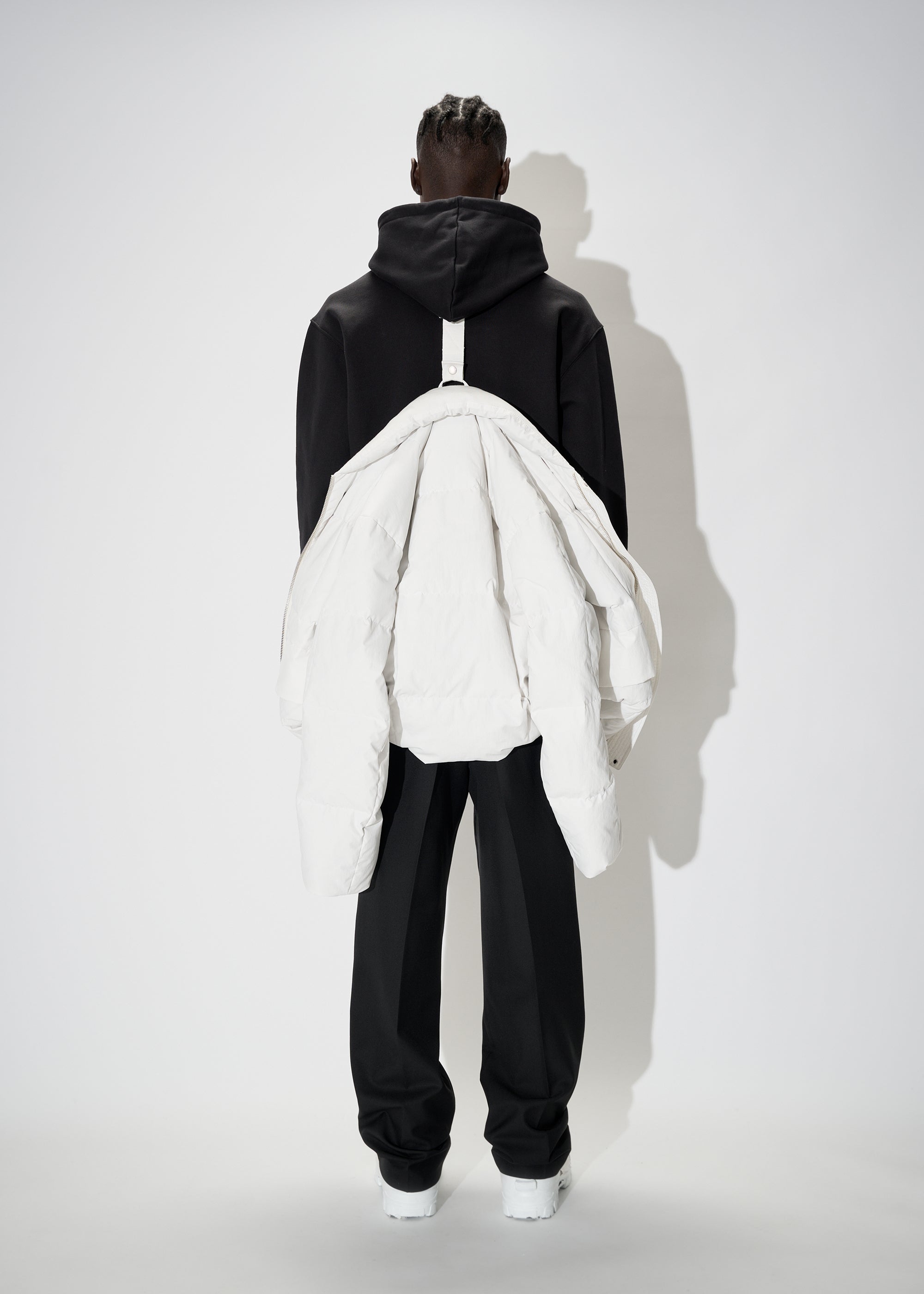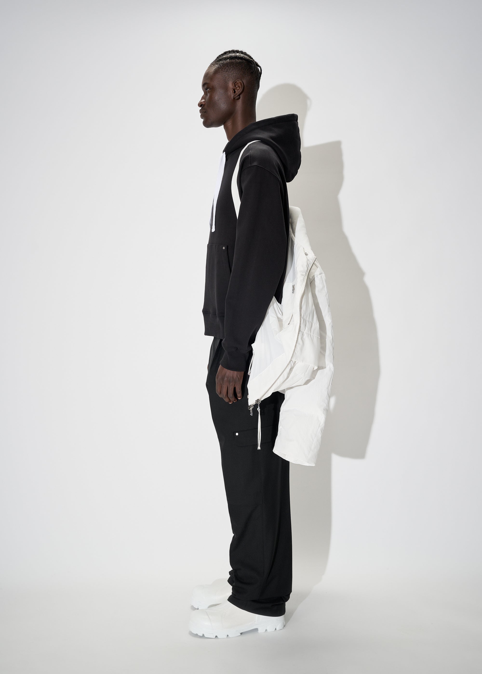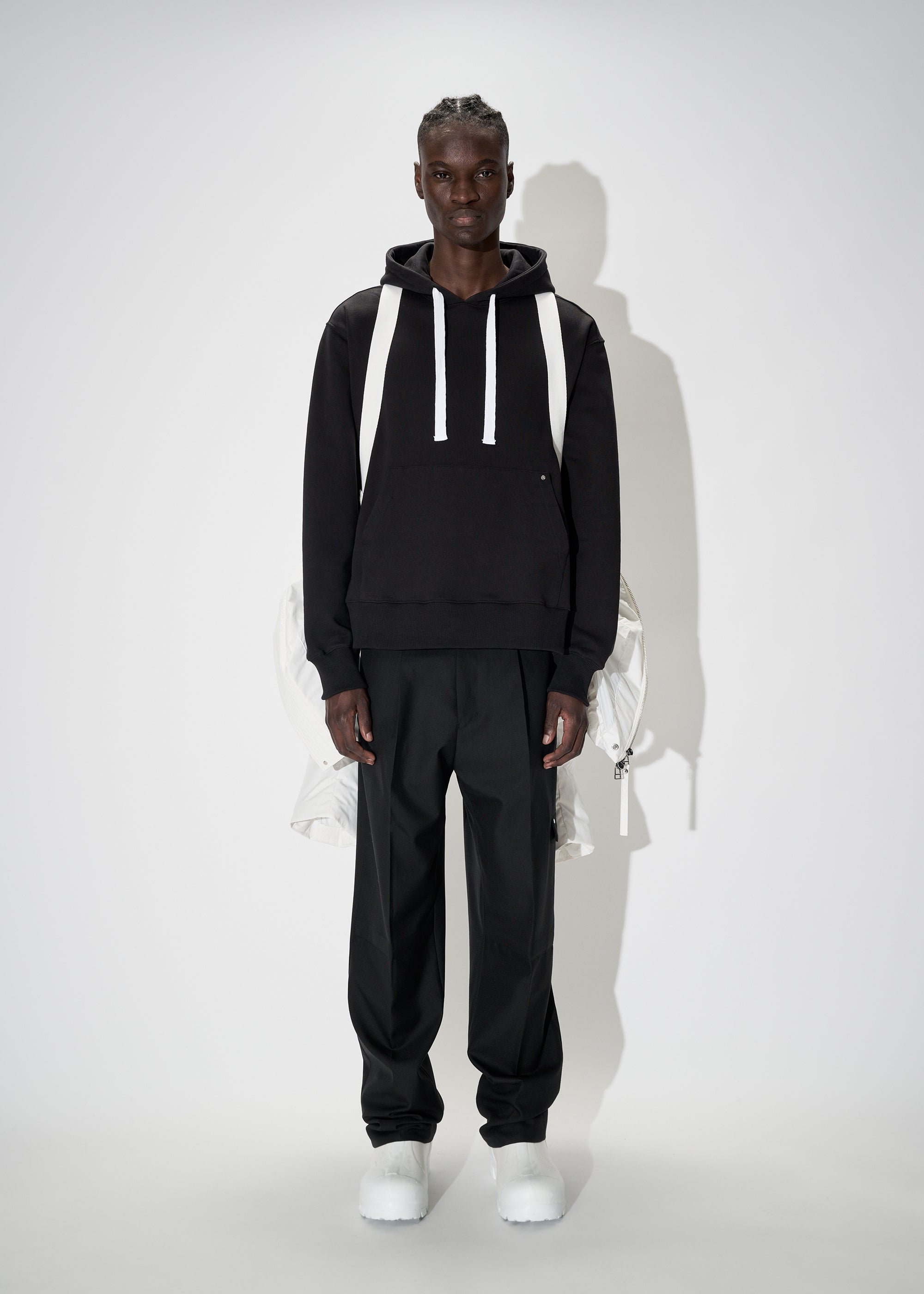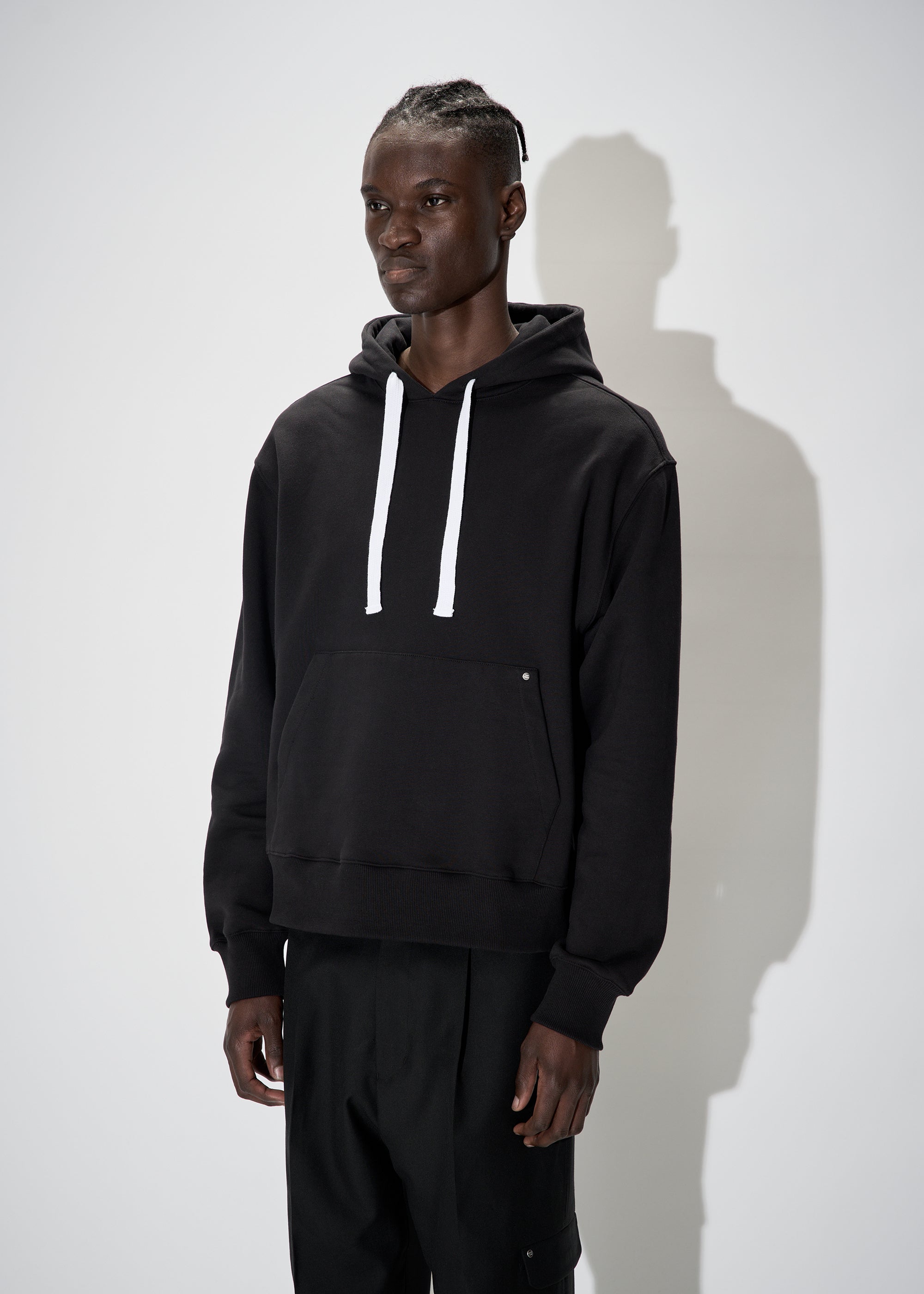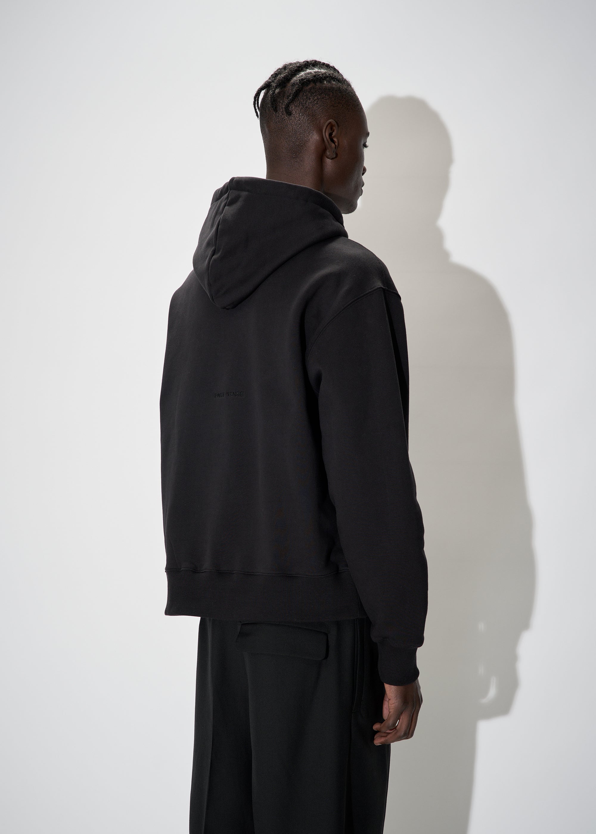 The Hooded Sweatshirt is crafted from heavy brushed-back cotton ensuring a sharp look and the outside and comfort and warmth of wear on the inside. The relaxed fit is complemented with a boxy shape. The garment is finished with a branded metal rivet on the left front side of the kangaroo pocket and the brand's logo embroidered in the centre back.