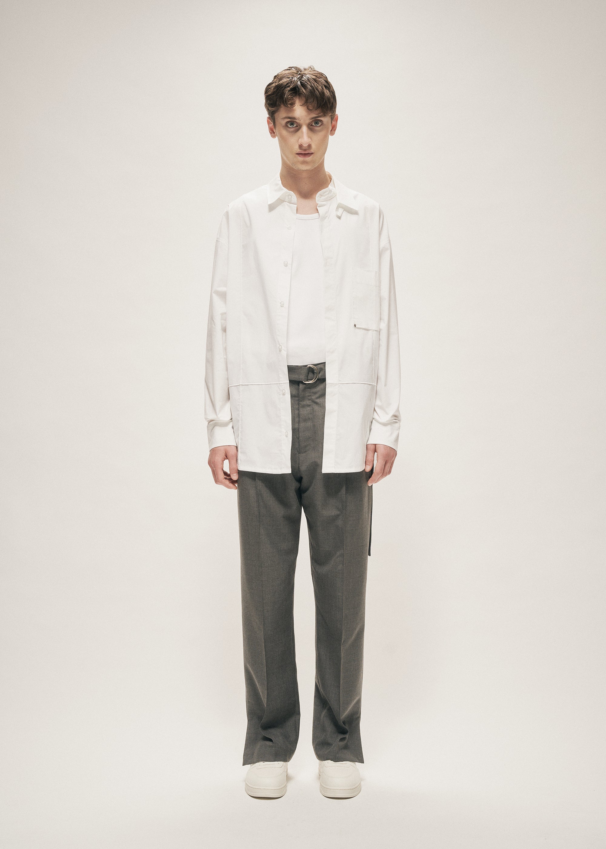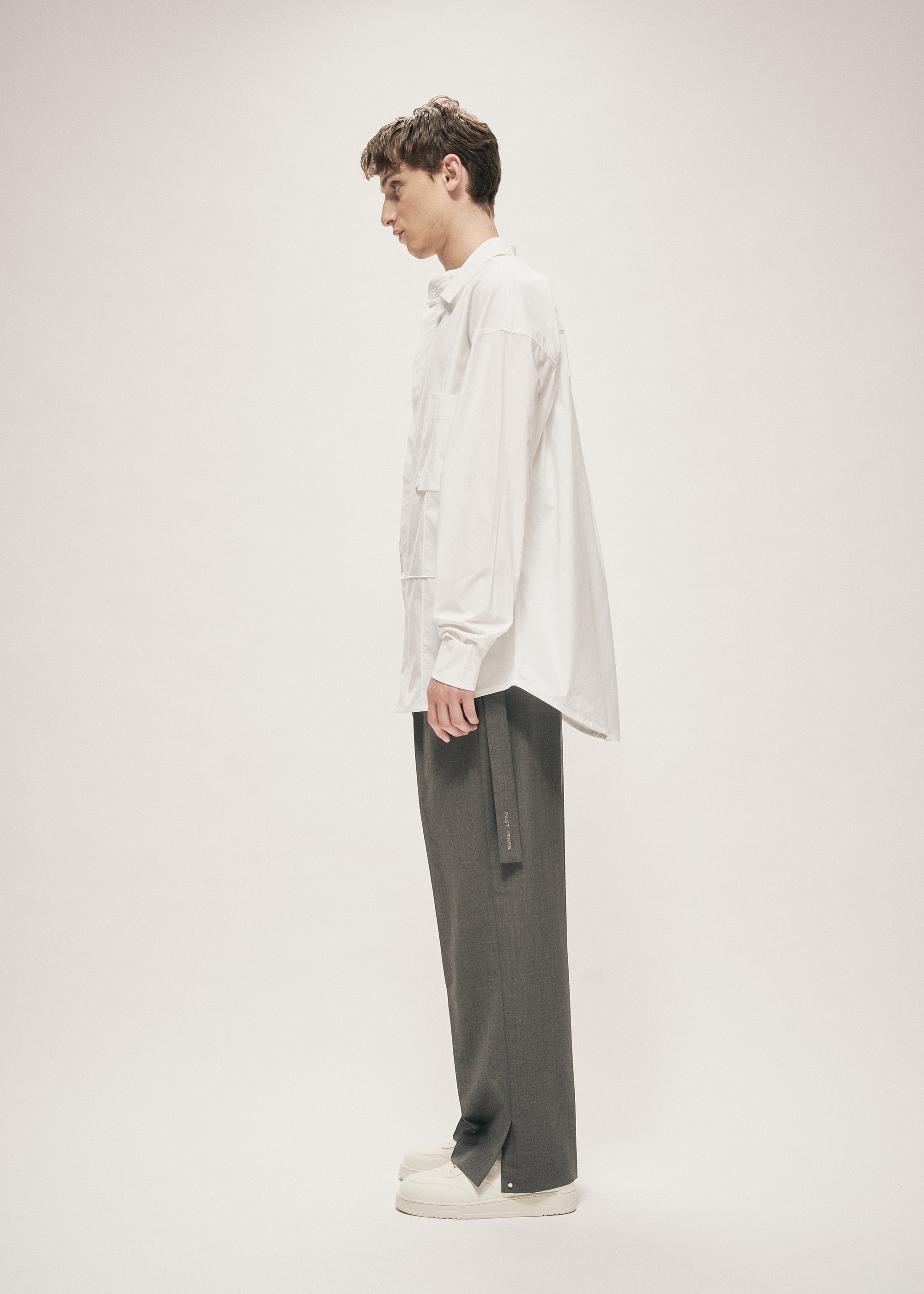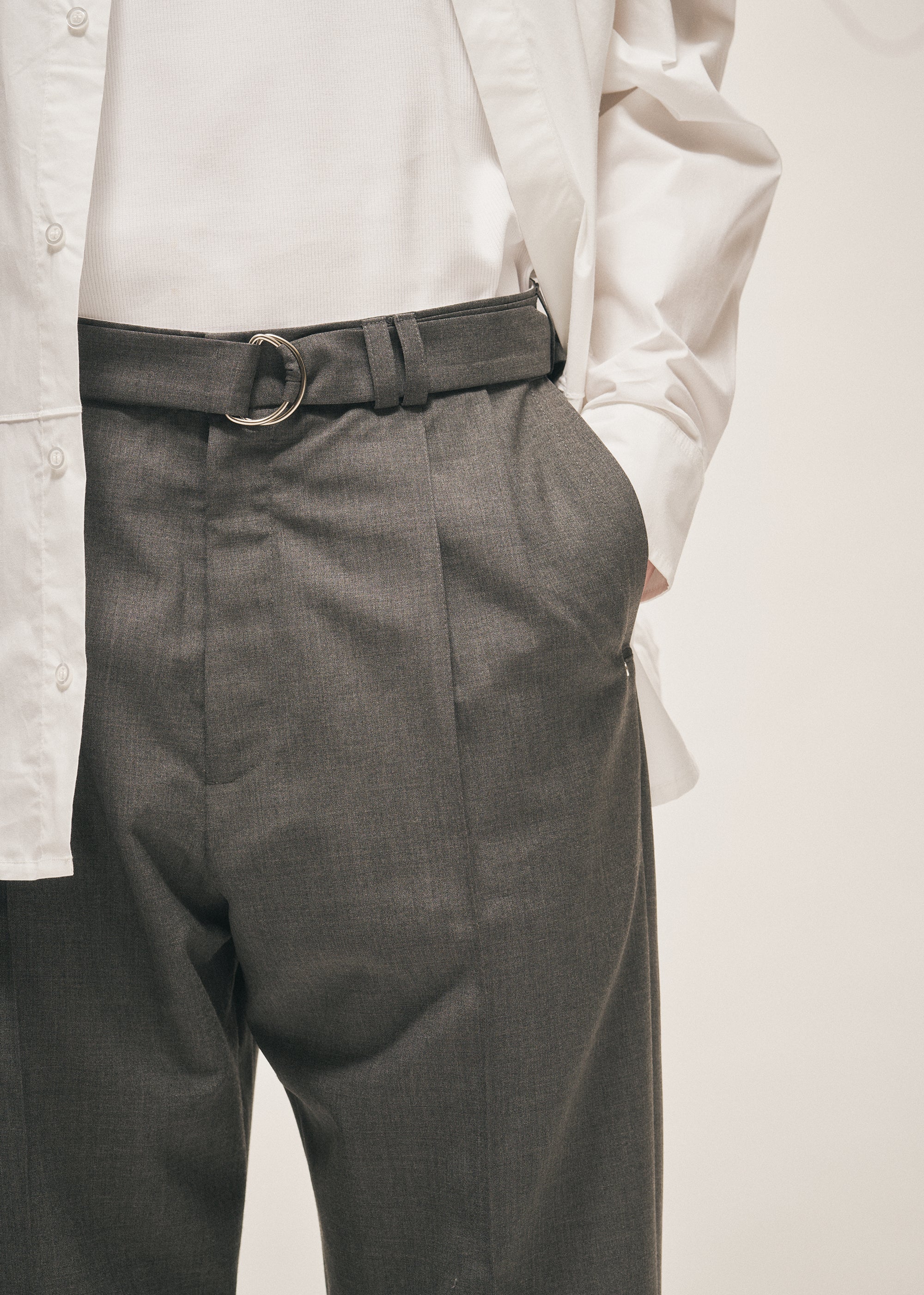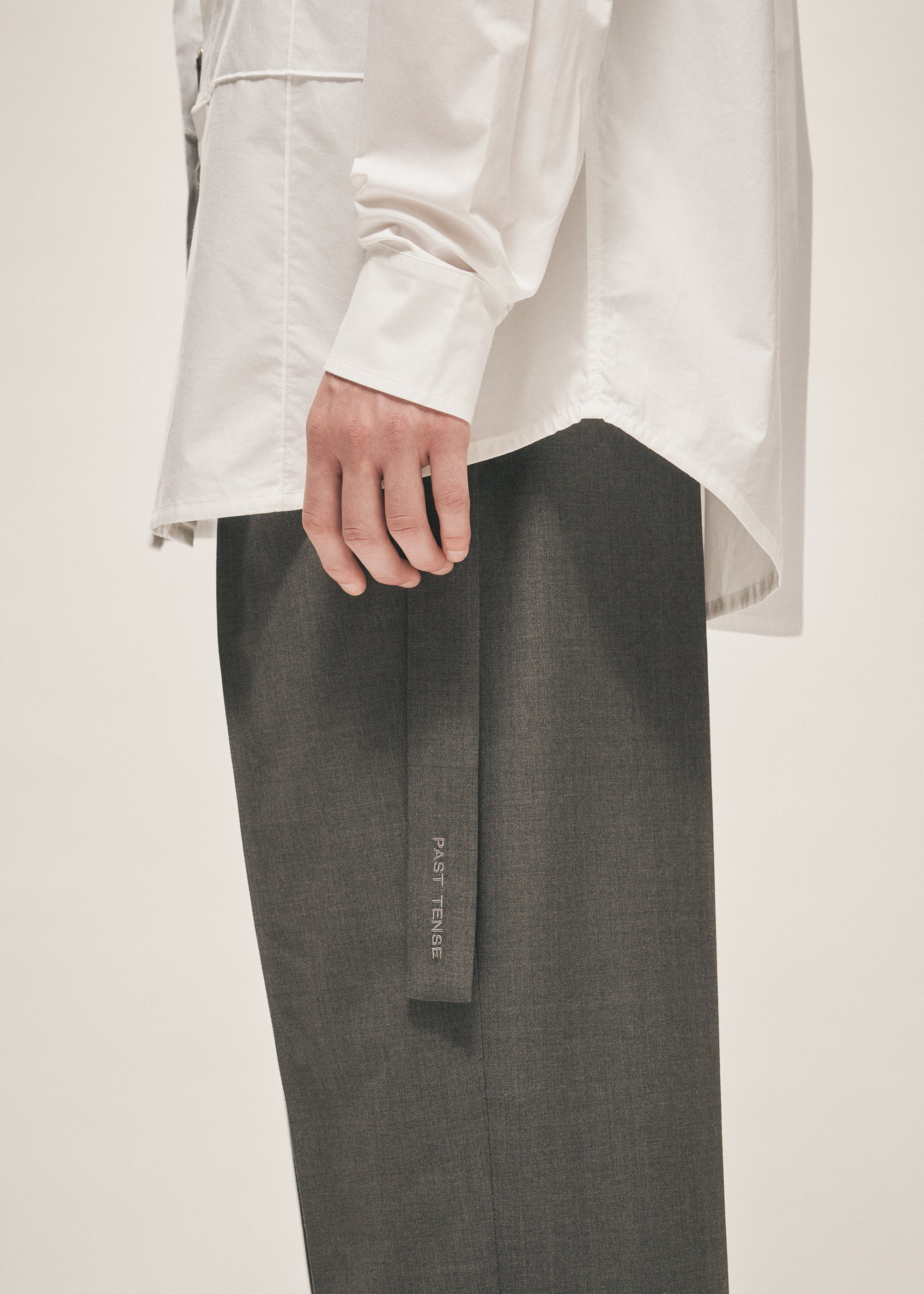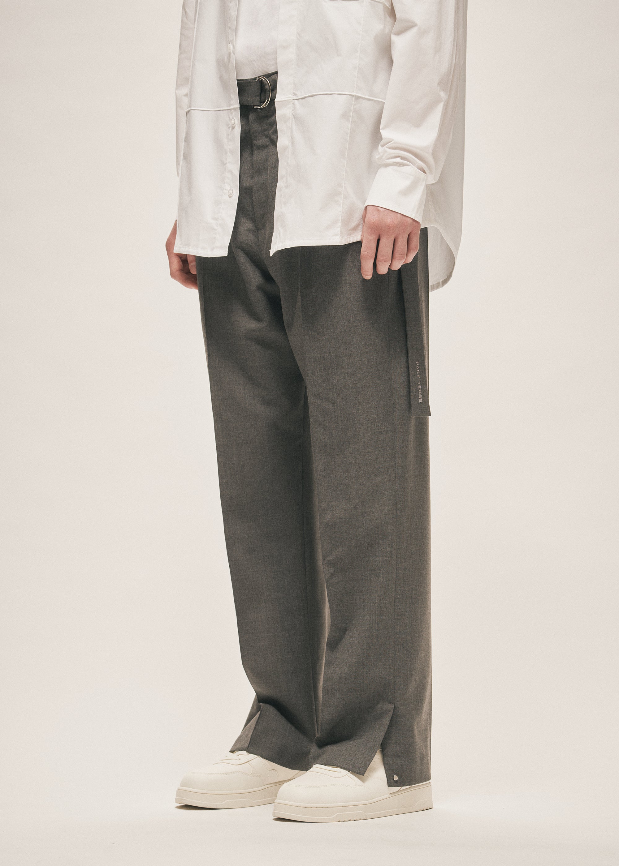 The Tropical Wool Belted Wide Leg Trousers are crafted from a Portuguese wool blend fabric to ensure a crisp look and maximum comfort during wear. Double pleated waist with a branded metal snap button closure and a snap button side slit at the cuffs. The inside is finished with a constructed waistline, half-lined and piping details. A removable self fabric belt completes the look. Embroidered logos on the belt and at the back of the waistband on a self fabric patch.