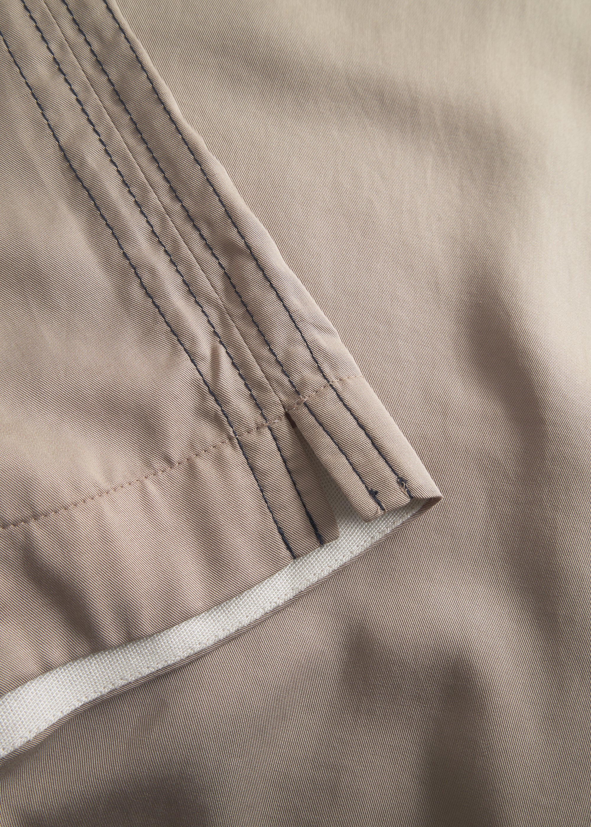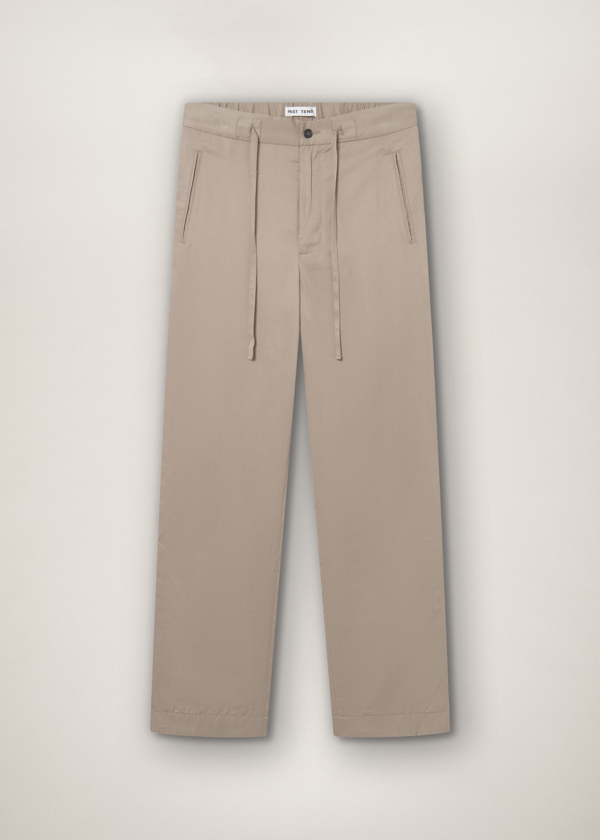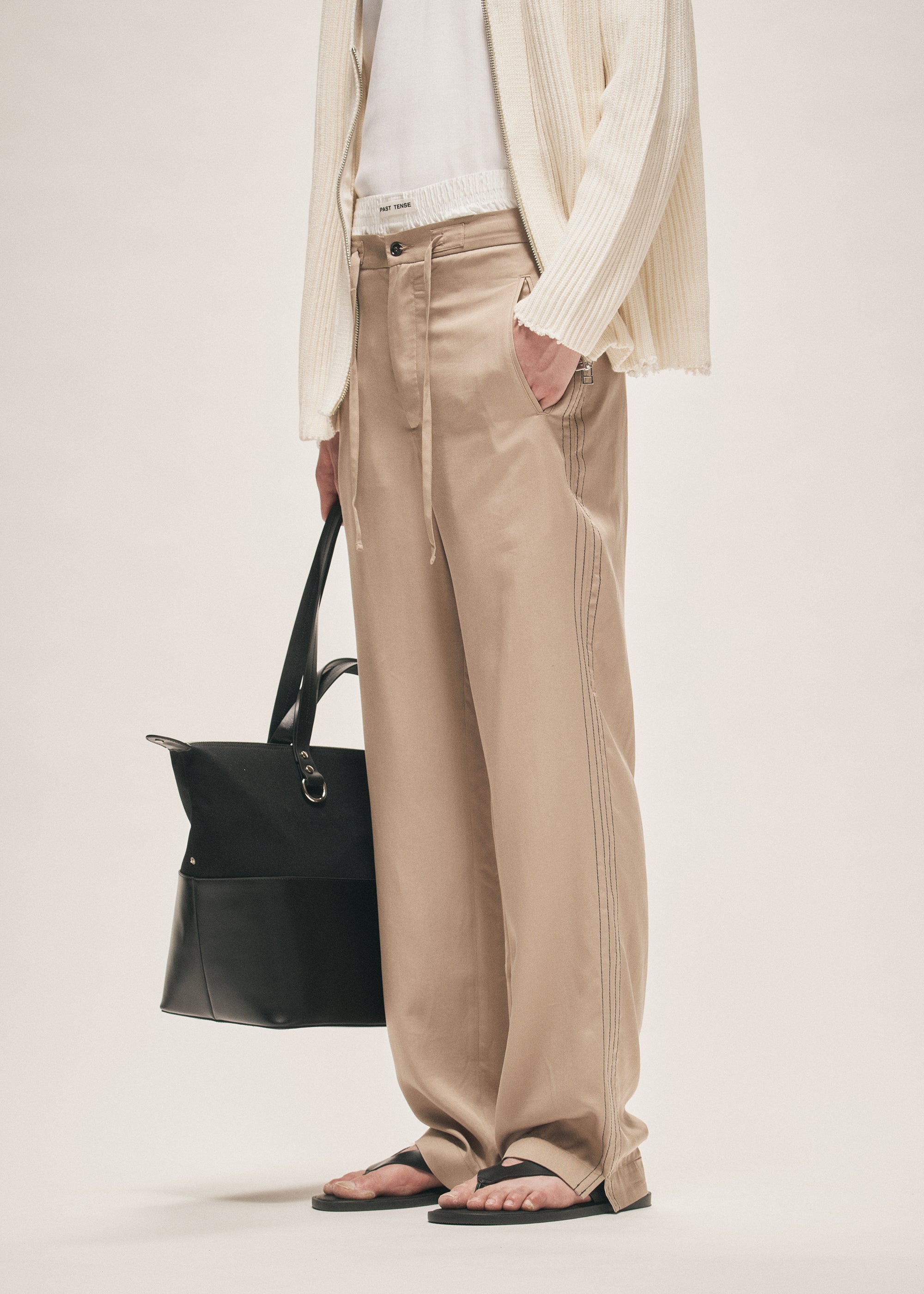 The Wide Leg Drawstring Tencel Trousers is our take on a modern leisure style track pant. Crafted from a lightweight Tencel® fabric ensuring comfortable wear and silky touch. The garment is finished with contrast stitch side stripes, a slit opening at the cuff and with webbing details on the inside. Branded with a Logo embroidery patch fixed by metal rivets at the upper back. The waist is adjustable with self fabric strings and is constructed with a elasticated back for an easy wear.