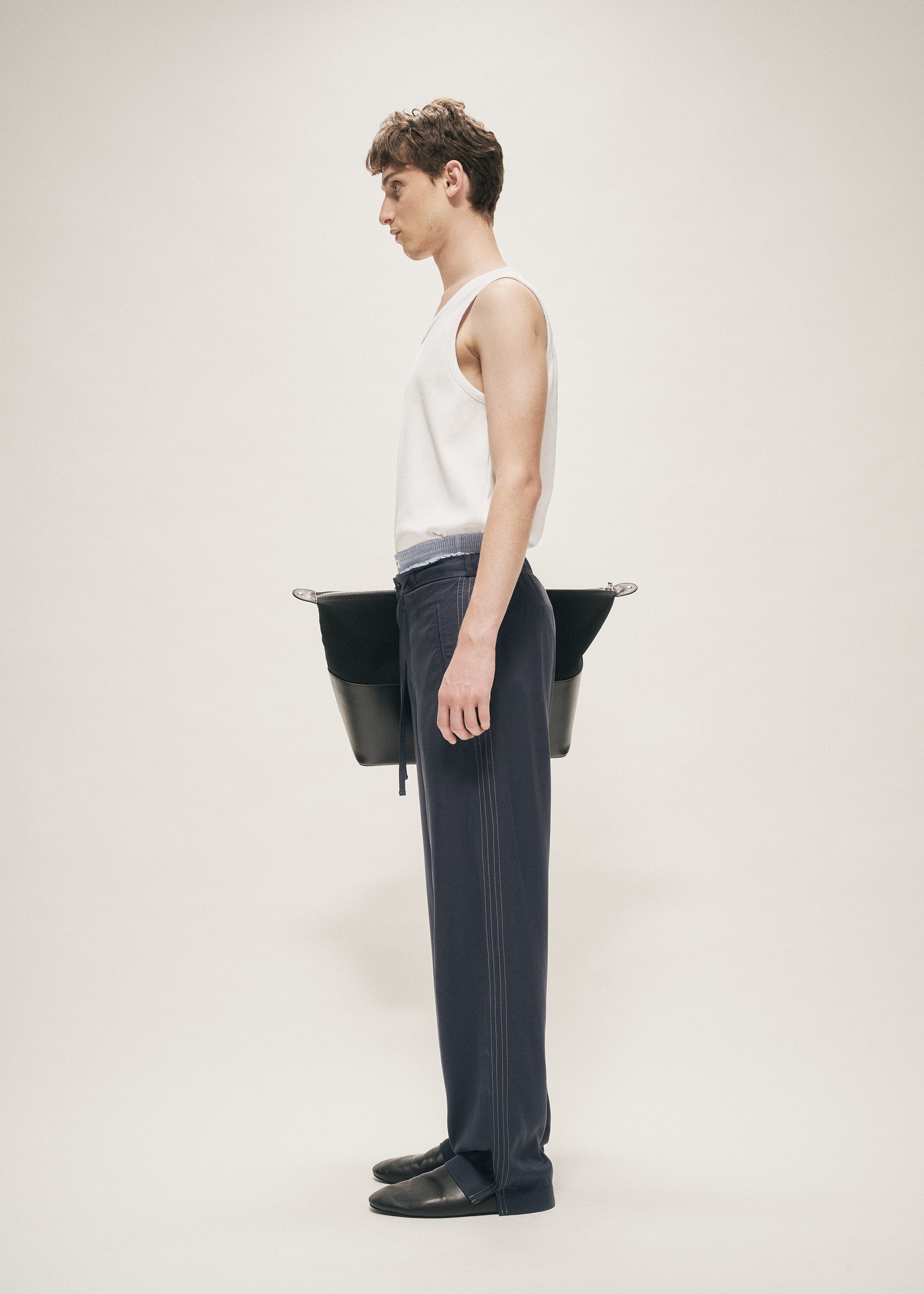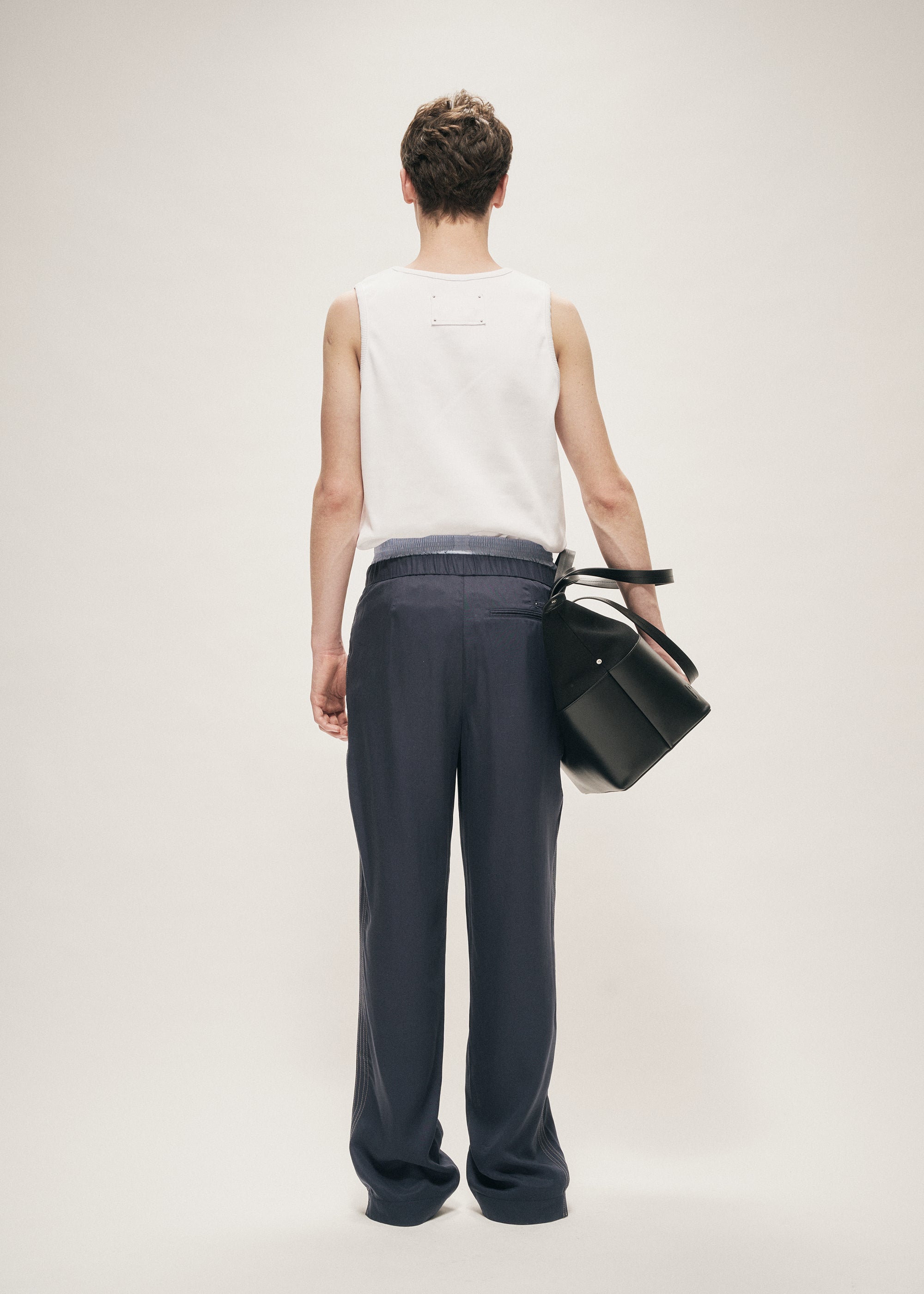 The Wide Leg Drawstring Tencel Trousers is our take on a modern leisure style track pant. Crafted from a lightweight Tencel® fabric ensuring comfortable wear and silky touch. The garment is finished with contrast stitch side stripes, a slit opening at the cuff and with webbing details on the inside. Branded with a Logo embroidery patch fixed by metal rivets at the upper back. The waist is adjustable with self fabric strings and is constructed with a elasticated back for an easy wear.