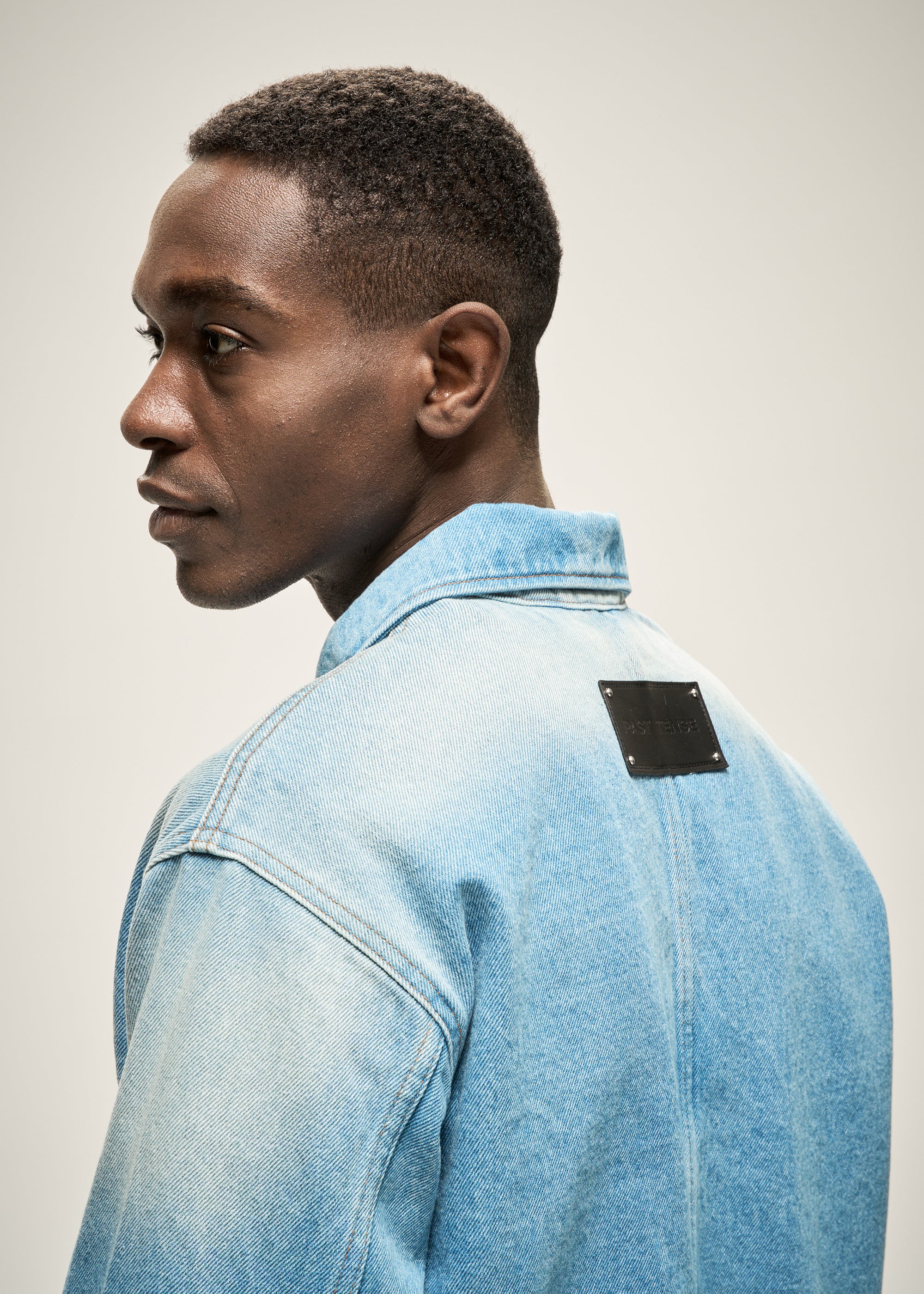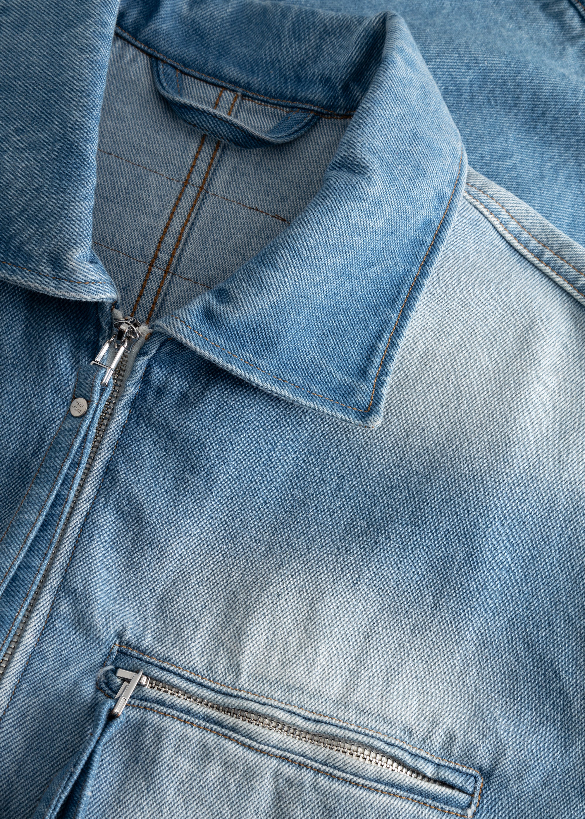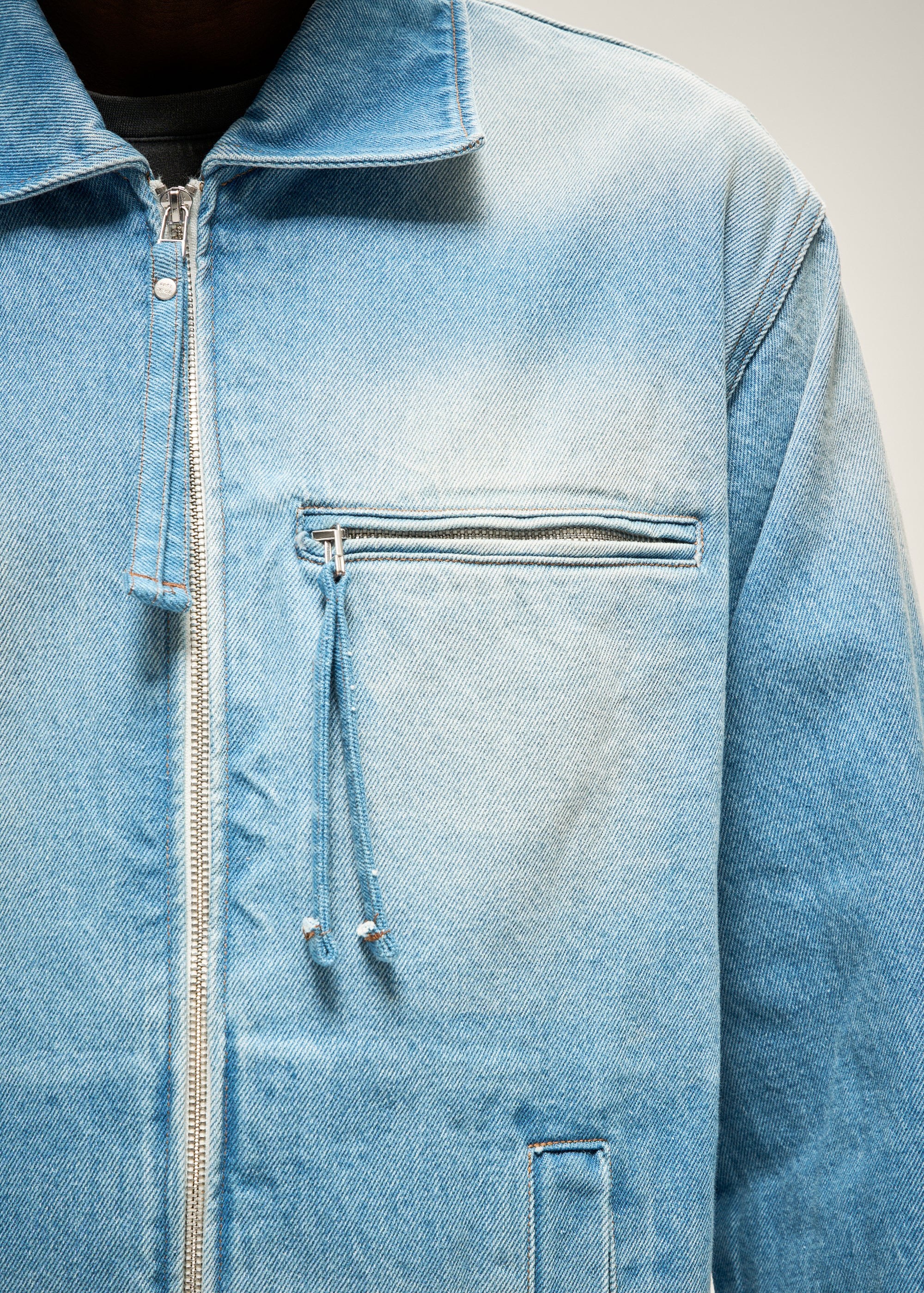 The Denim Zip Work Jacket is crafted from raw Denim and washed with care, ensuring durable wear and a distressed look. The jacket is finished with metal zips, a genuine leather patch at the back and a chest zip pocket.