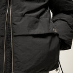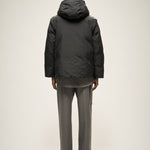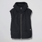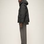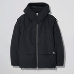 The detachable sleeves make it possible to wear as a vest across seasons and the removable shoulder straps ensure that it can be carried as a backpack in between wears. Four outside pockets and one inside pocket complement the functionalities of the jacket. The branded ring on the left side flap adds an anchor point for key rings and carabiners.