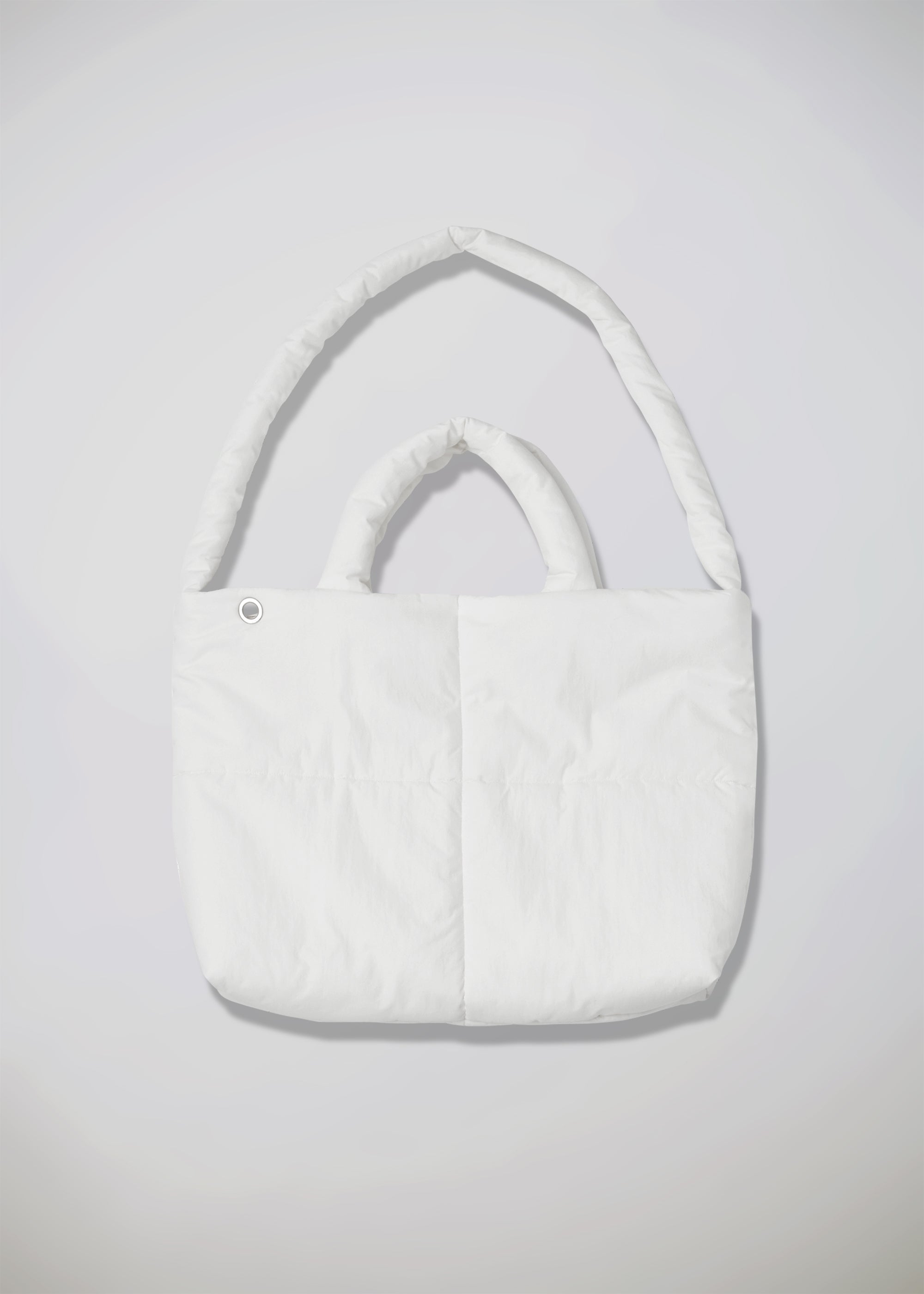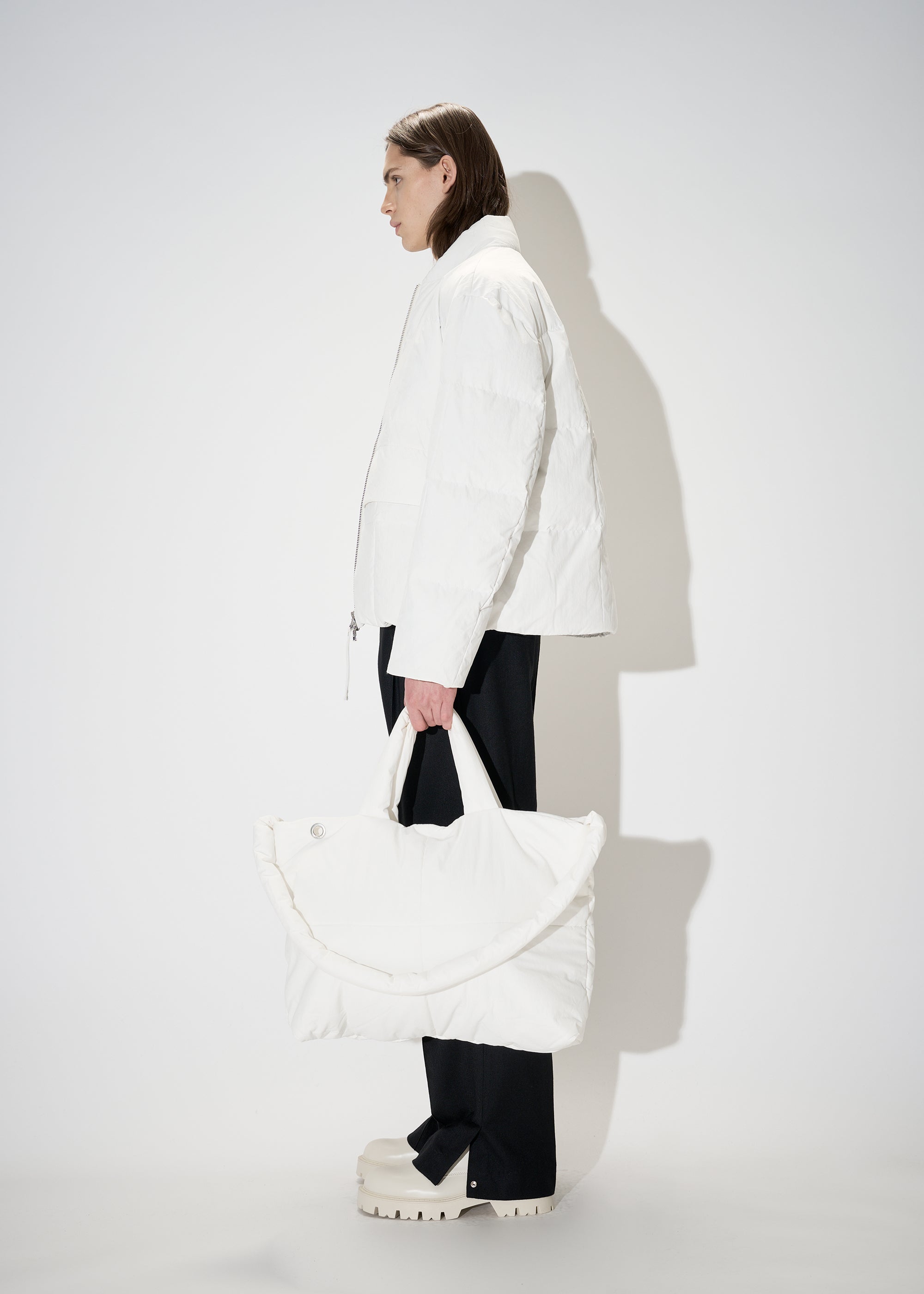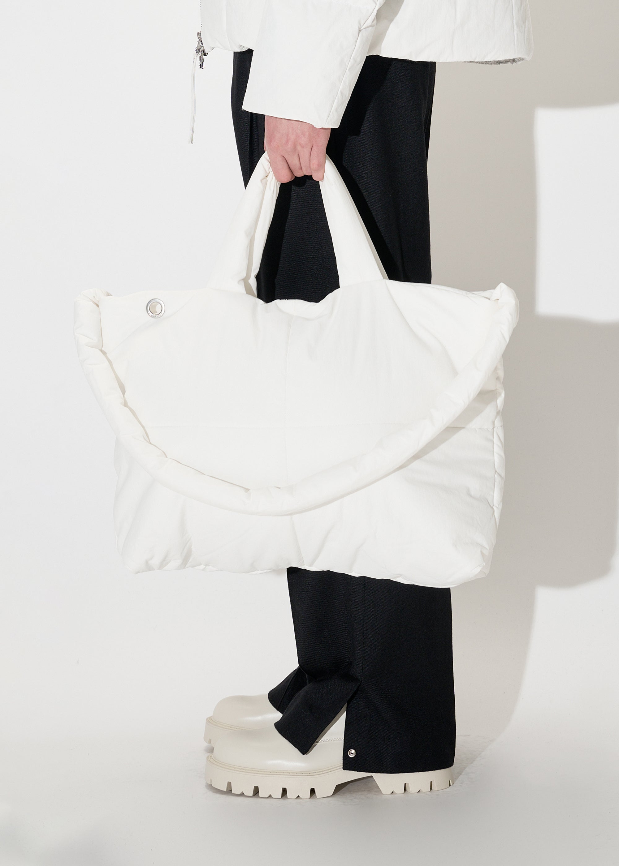 The Nylon Insulated Tote Bag is heavily padded for a puffy look and extra protection for your belongings. The nylon-cotton main fabric is finished with PFC-free water-repellent treatment to allow for harsh weather wear.