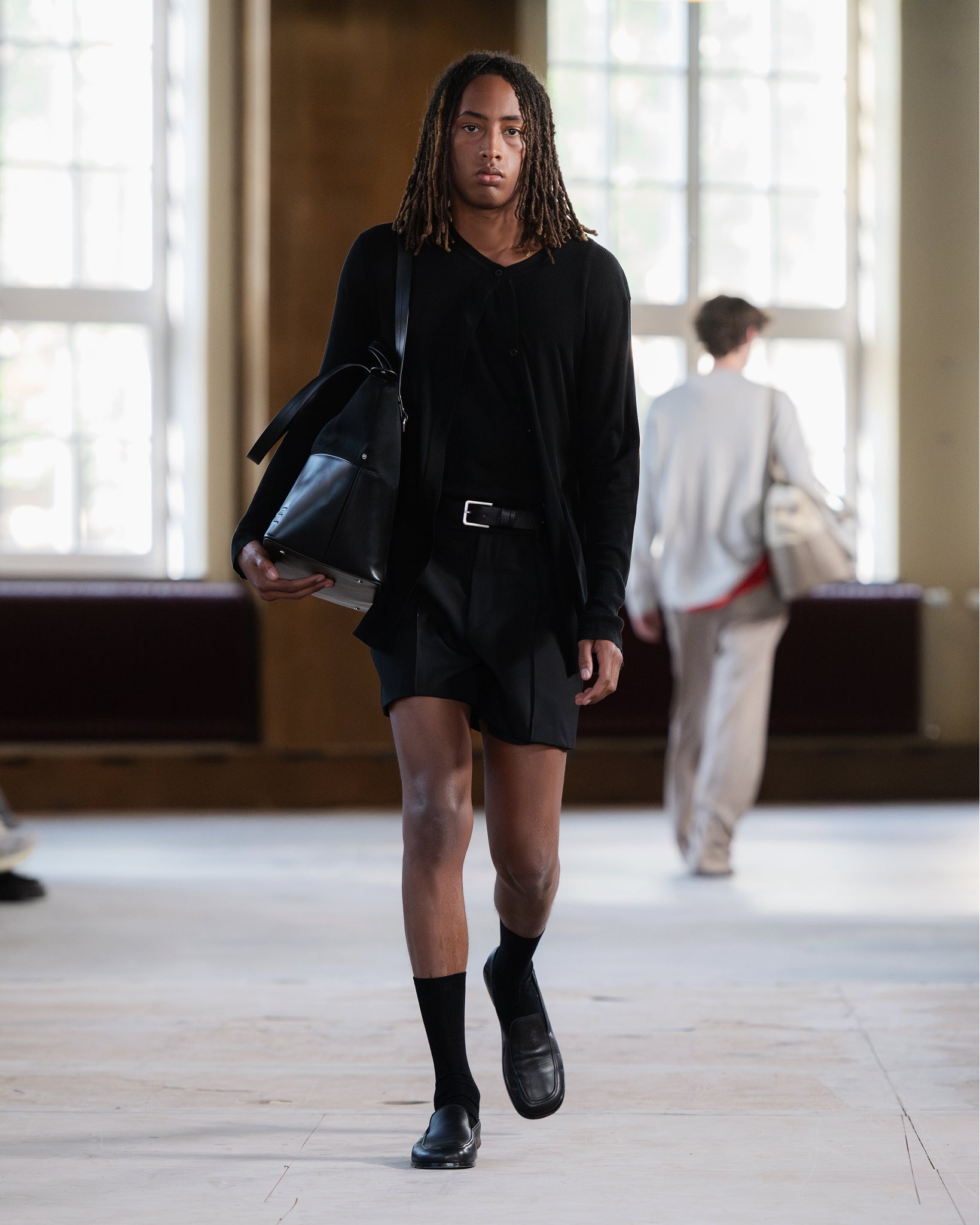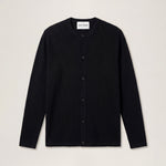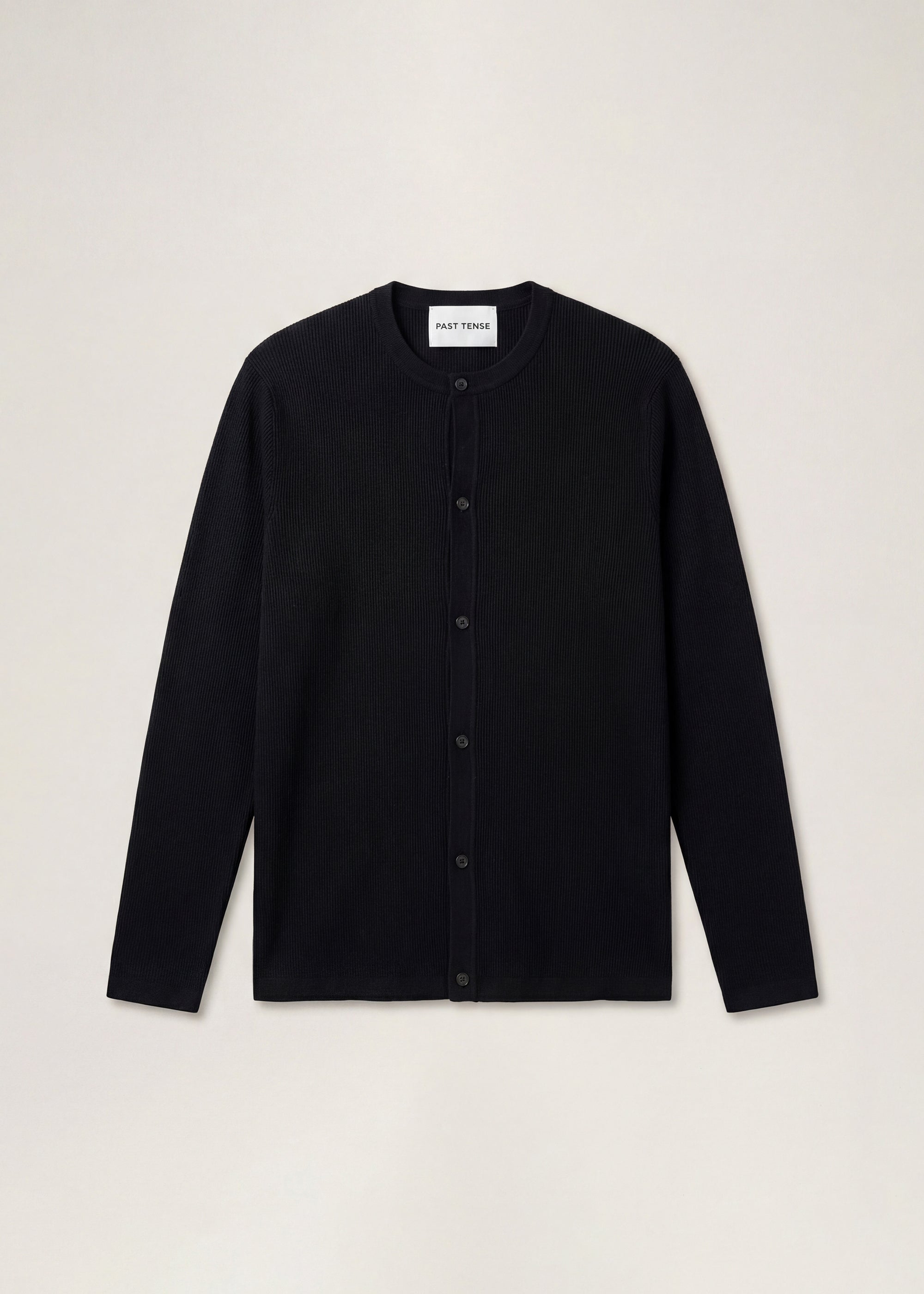 The Rib Knit L/S Collarless Shirt is crafted from a blend of Silk, Wool, and Tencel yarn, showcasing the brand logo embroidered on a patch at the upper back.