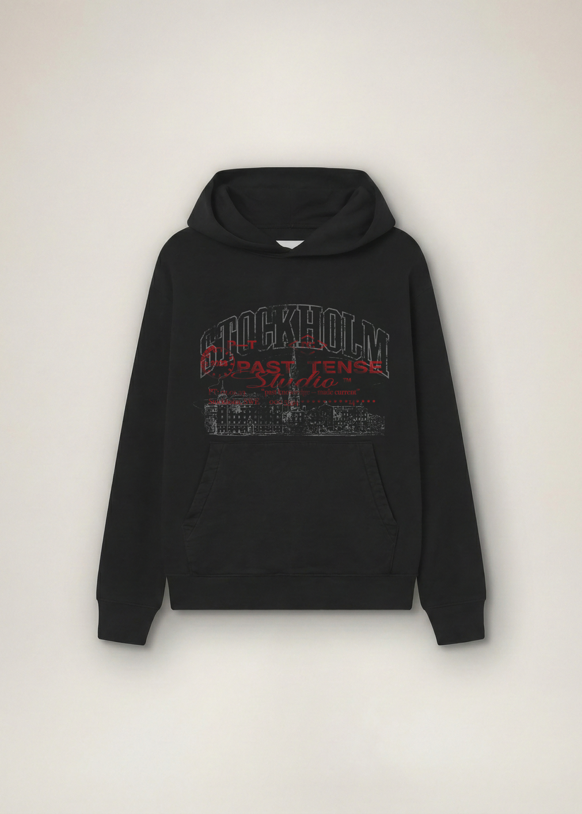 The Stockholm Hoodie is crafted from heavy brushed-back cotton ensuring a sharp look and the outside and comfort and warmth of wear on the inside. The relaxed fit is complemented with a boxy shape. The garment is finished with a seasonal logo printed at the center chest.